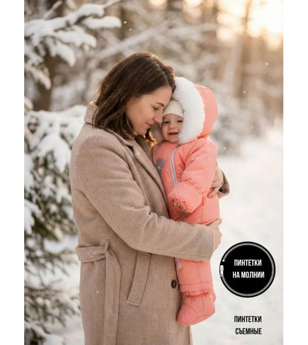 - Функциональные изделия для комфорта Отвороты на рукавах заменяют варежки, капюшон на резинке защищает голову от сквозняков и холода, съемные пинетки не сползают и легко крепятся.