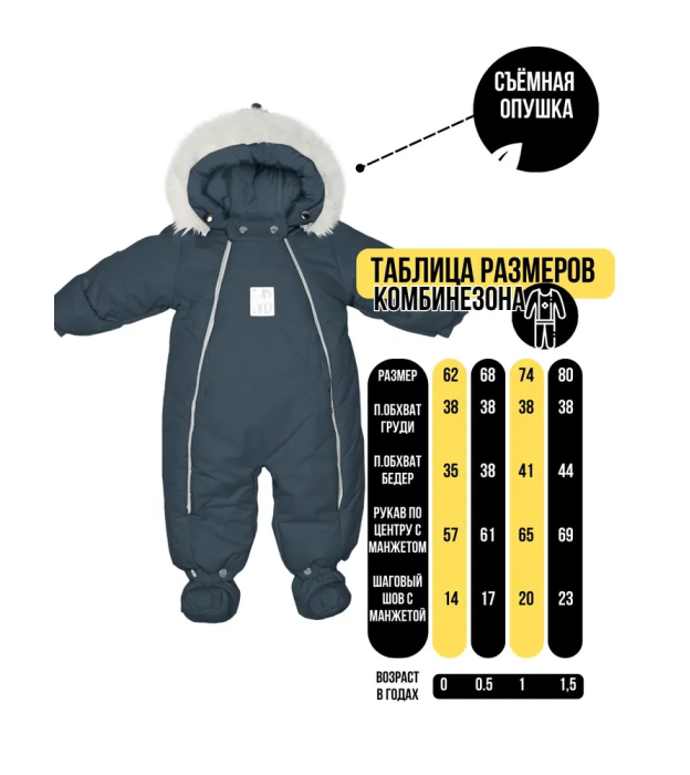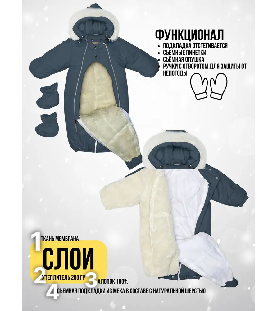 Функциональные изделия для комфорта Отвороты на рукавах заменяют варежки, капюшон на резинке защищает голову от сквозняков и холода, съемные пинетки не сползают и легко крепятся.