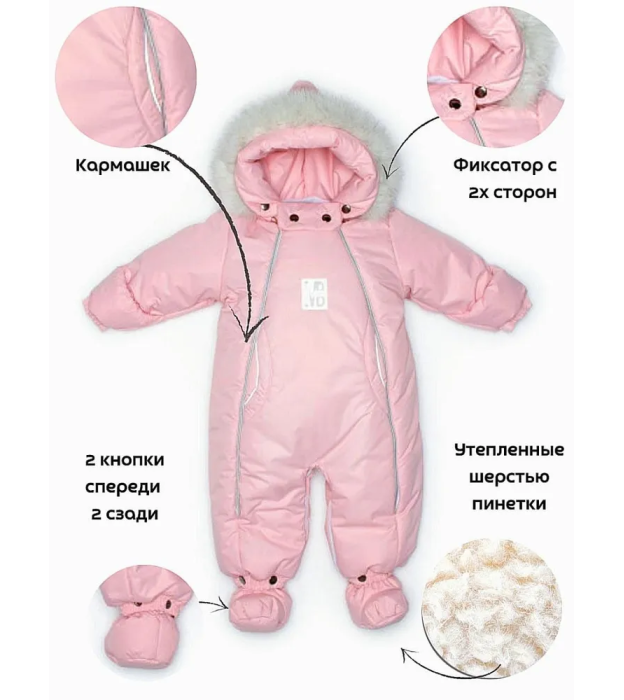 Надёжные материалы и утеплитель Мембранная ткань устойчива к влаге и ветру, не боится дождя и мокрого снега, а подкладка из овечьей шерсти и синтепона сохраняет оптимальный температурный режим. Функциональные детали для комфорта Отвороты на рукавах заменяют варежки, капюшон на резинке защищает голову от сквозняков и холода, съемные пинетки не сползают и легко крепятся. Все материалы безопасны для детей с первых дней жизни поэтому гарантируют Гипоаллергенность и простота ухода , легко стираются и быстро сохнут, сохраняют внешний вид даже после многочисленных стирок.
