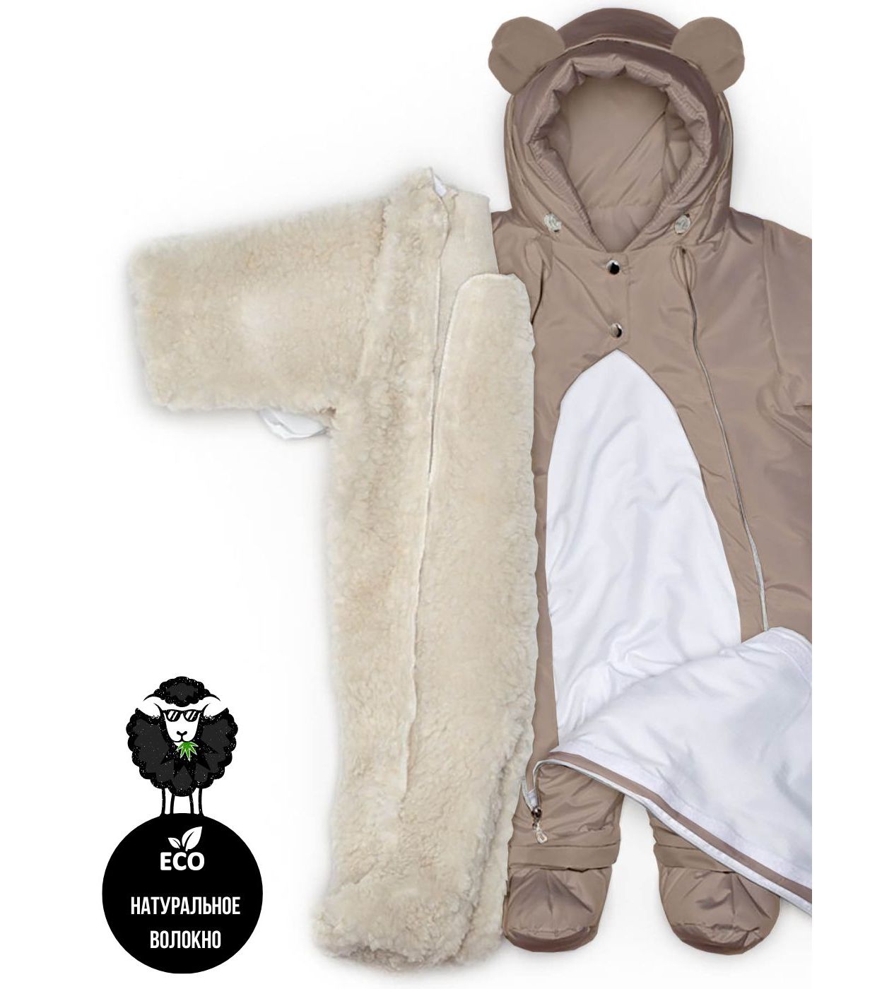 4. Съемная теплая подкладка, содержащая натуральное шерстяное волокно, обеспечивает оптимальную температуру внутри комбинезона в холодные дни, сохраняя тепло и избегая перегрева.