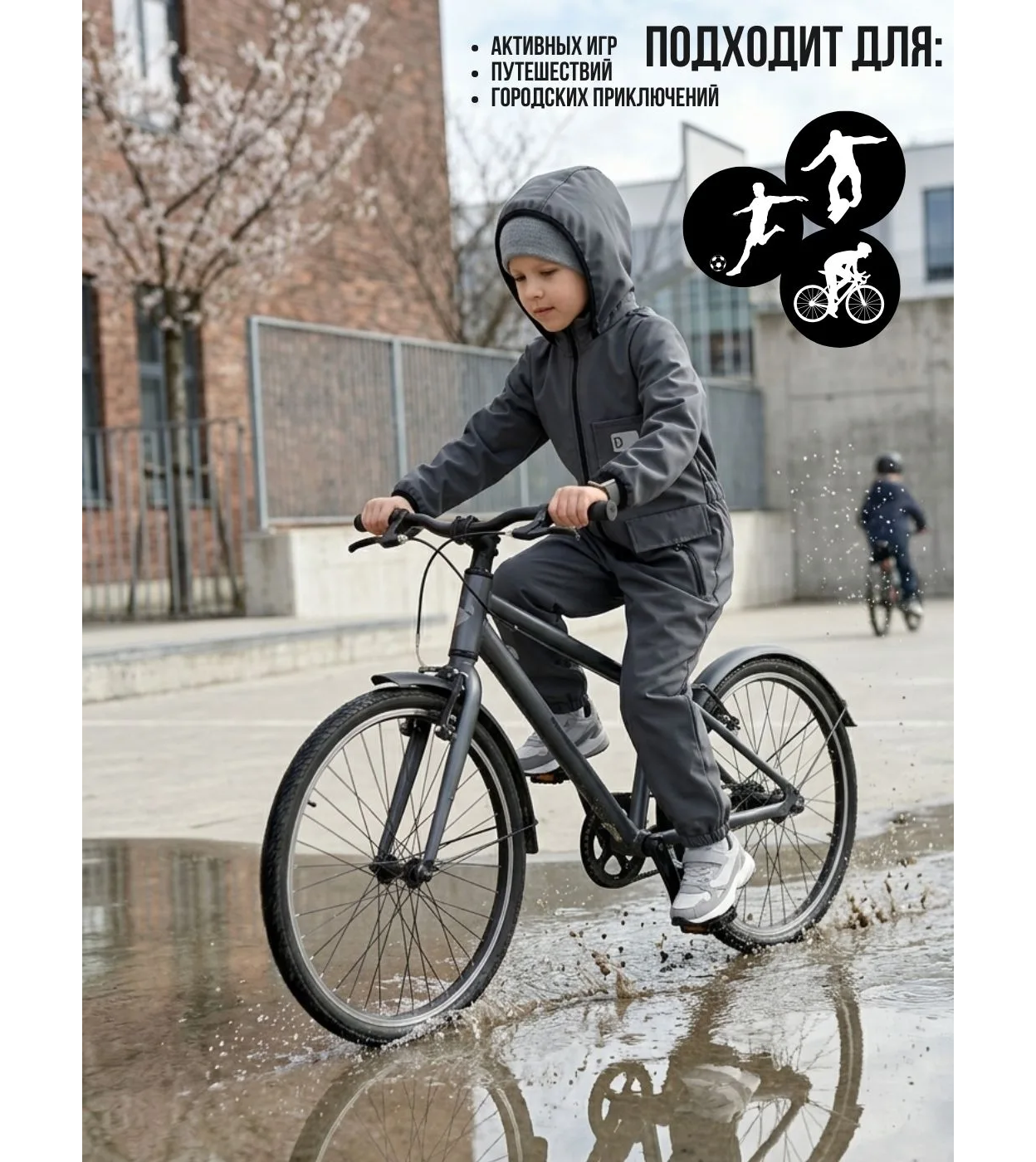 Перед Вами лучший демисезонный мембранный комбинезон из ткани softshell на весну и осень. Легкий и дышащий, но при этом прекрасно сохраняющий тепло. Темп. режим от +5 до +20 (в зависимости от нижнего слоя). 4 причины выбрать нас: 1. Высочайшие показатели мембраны 10к/5к. Наша ткань не даст ребёнку вспотеть. 2. Прочные усиленные наколенники из неопрена. Наше Ноу-Хау. Смягчает удары при падении, не пропускает воду, и совершенно не страдает от механических трений. Ползайте, сидите на коленях в мокром песке, падайте - с ними ничего не будет. 3. Идеальная по посадке модель. 4. Функциональные элементы: лямки на плечах для снятия комбеза в тепле, без полного раздевания, светоотражающие элементы, глубокий капюшон, вшивные прорезиненные штрипки, молния с аква и ветро защитой.