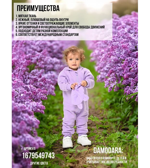 Фасон: комбинезон с капюшоном и длинной молнией — удобно надевать и снимать.