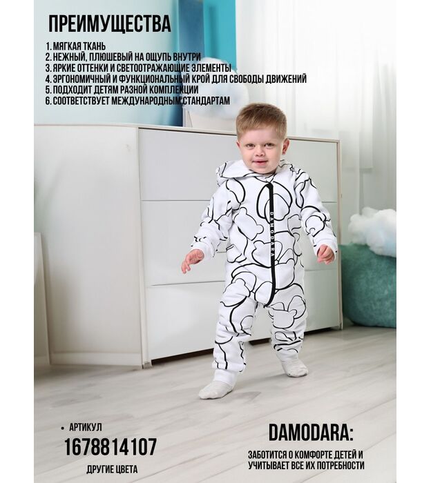 • Фасон: комбинезон с капюшоном и длинной молнией — удобно надевать и снимать.