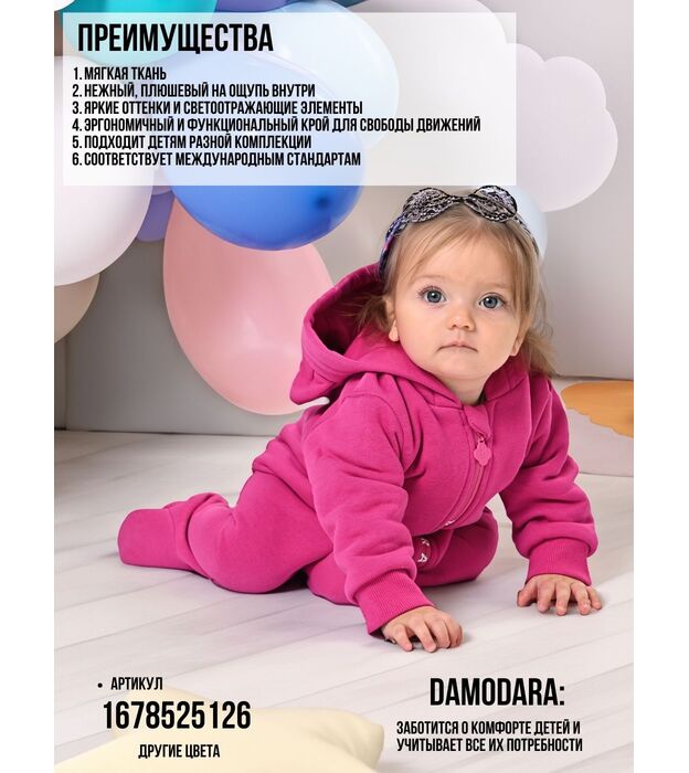 • Фасон: комбинезон с капюшоном и длинной молнией — удобно надевать и снимать.