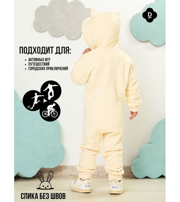 Фасон: комбинезон с капюшоном и длинной молнией — удобно надевать и снимать.