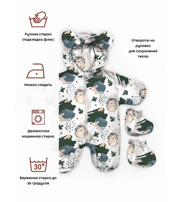 Демисезонный комбинезон изготовлен из непромокаемой, мягкой ткани с утеплителем. Внутри комбинезона дышащая подкладка из 100% хлопка и утепленная спинка из мягкого флиса. Молния и кнопки между ножек не доставляют хлопот при раздевании малыша и позволяют маме снять комбинезон не снимая ботинок, что очень удобно. Отвороты на рукавах заменяют варежки, которые согреют маленькие ручки вашего малыша в холодную погоду. Плотно прилегающий к голове капюшон защитит от ветра за счет вшитой утягивающей резинки, а игривые ушки на капюшоне сделают образ малыша еще милее. В комплекте идут отстегивающиеся пинетки, которые, будут греть ножки, и не будут выделяться из общего стиля. Рассчитан на температурный режим от +15 С до +5 С.