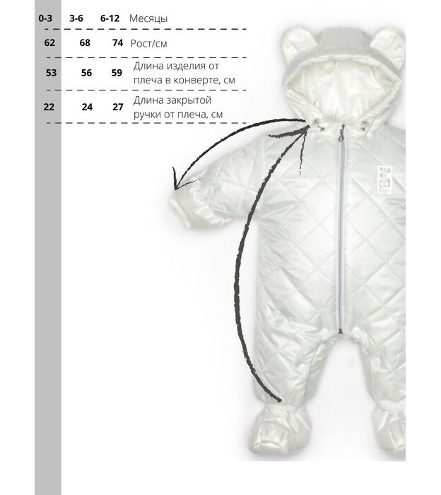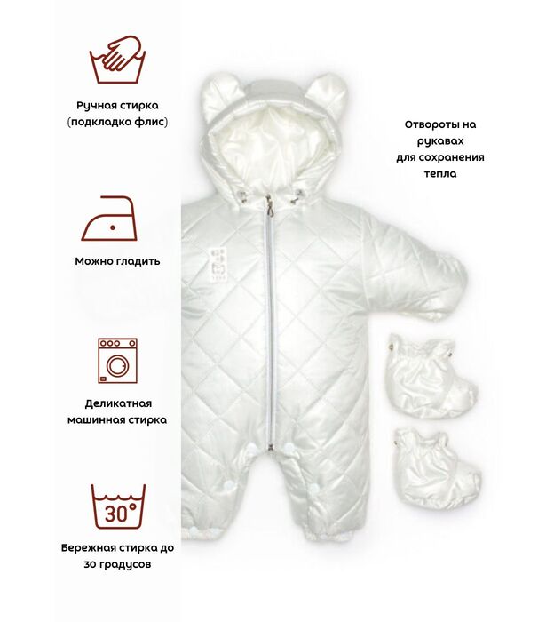 Демисезонный комбинезон изготовлен из непромокаемой, мягкой ткани с утеплителем. Внутри комбинезона дышащая подкладка из 100% хлопка и утепленная спинка из мягкого флиса. Молния и кнопки между ножек не доставляют хлопот при раздевании малыша и позволяют маме снять комбинезон не снимая ботинок, что очень удобно. Отвороты на рукавах заменяют варежки, которые согреют маленькие ручки вашего малыша в холодную погоду. Плотно прилегающий к голове капюшон защитит от ветра за счет вшитой утягивающей резинки, а игривые ушки на капюшоне сделают образ малыша еще милее. В комплекте идут отстегивающиеся пинетки, которые, будут греть ножки, и не будут выделяться из общего стиля. Рассчитан на температурный режим от +15 С до +5 С.