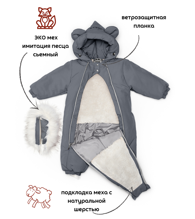 Комбинезон детский зимний для новорожденных. Этот классический детский зимний комбинезон превосходное дополнение к зимнему гардеробу. Он изготовлен из сверхпрочного материала и поэтому станет идеальным выбором для активных детей, которые любят играть на свежем воздухе. Съемный капюшон обеспечивает дополнительную безопасность и эффективно защищает щечки от морозного ветра, а съемные штрипки не дадут концам брючин задираться во время веселых игр на свежем воздухе. Дополнительно утеплен несъемной жилеткой с содержанием шерсти.