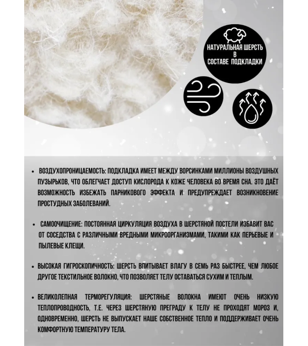 Верх: Мембрана (100% полиэстер), утеплитель- синтепон (400 гр), подкладка с содержанием шерсти 10%