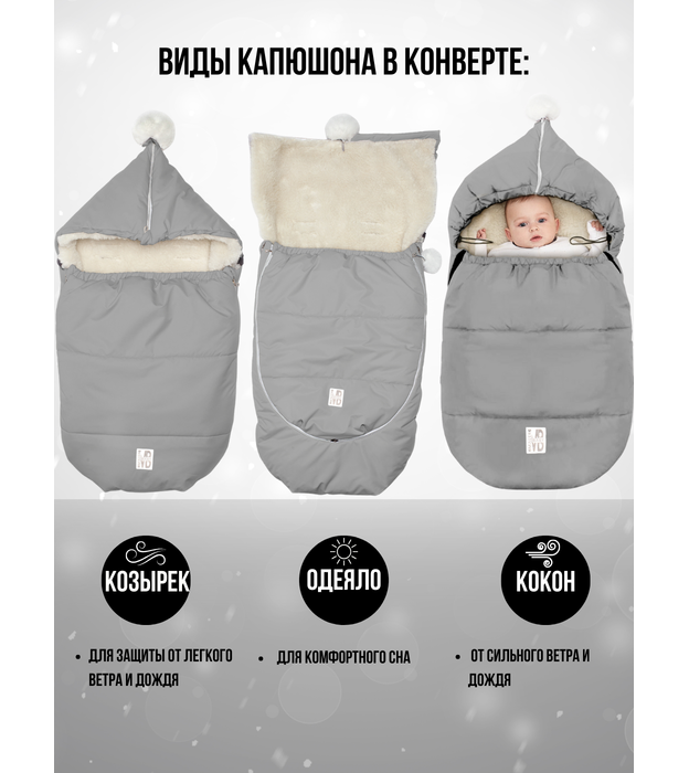 Конверт в коляску зимний. Зимний меховой конверт в коляску - трансформер незаменимая и удобная вещь для прогулок с ребенком в холодное время года. Комбинезон детский зимний конверт рассчитан на холода до -30 С и состоит из трех защитных слоев: верх-мембрана, плотного утеплителя и подкладки из искусственного меха с натуральной шерстью. Имеется возможность трансформации конверта из размера (роста ) 85 см. в размер 105 см. Накидка для ножек может быть полностью расстегнута и конверт трансформируется в теплый мягкий плед. Вдоль молнии вшита дополнительная вставка из ткани, препятствующая попаданию меха в молнию. Светоотражающая нашивка обеспечивает дополнительную защиту ребёнка в темное время суток. В конверте предусмотрены прорези для 5 точечных ремней безопасности автомобиля и клапан для крепления конверта к спинке колясок/санок. На капюшоне и на самом конверте два съёмных помпона из эко-меха. В комплекте с конвертом муфта в тон конверту. Одежда для новорожденных.