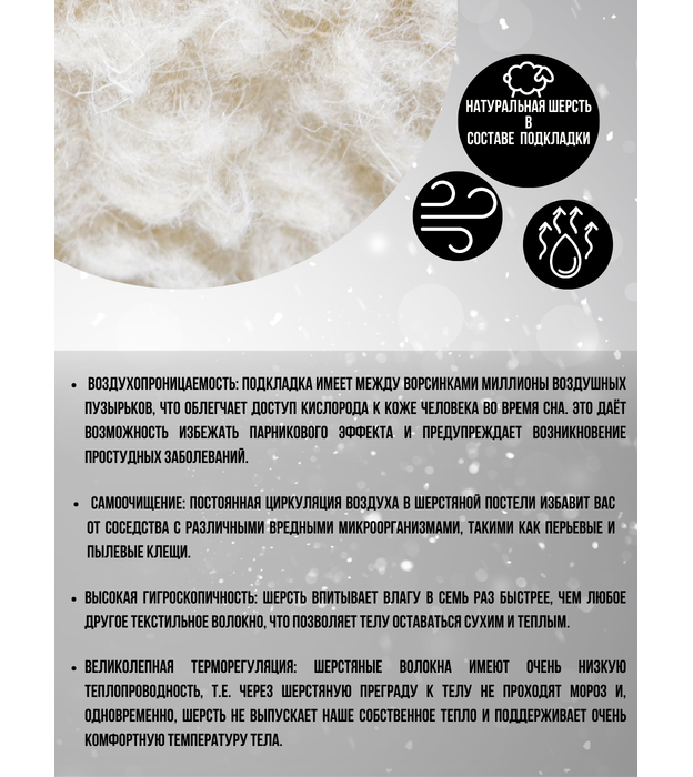 Верх: 100% ПЭ, утеплитель- синтепон 100 гр, подкладка несъемная с содержанием шерсти 10%