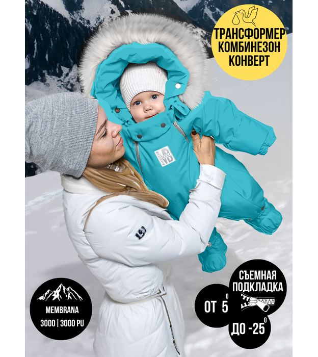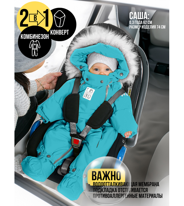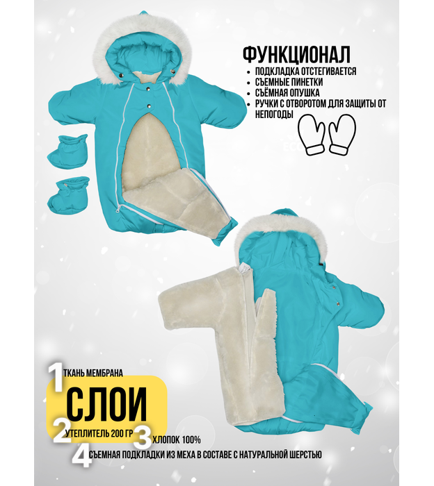 Надёжные материалы и утеплитель Мембранная ткань устойчива к влаге и ветру, не боится дождя и мокрого снега, а подкладка из овечьей шерсти и синтепона сохраняет оптимальный температурный режим. Функциональные детали для комфорта Отвороты на рукавах заменяют варежки, капюшон на резинке защищает голову от сквозняков и холода, съемные пинетки не сползают и легко крепятся. Все материалы безопасны для детей с первых дней жизни поэтому гарантируют Гипоаллергенность и простота ухода , легко стираются и быстро сохнут, сохраняют внешний вид даже после многочисленных стирок.