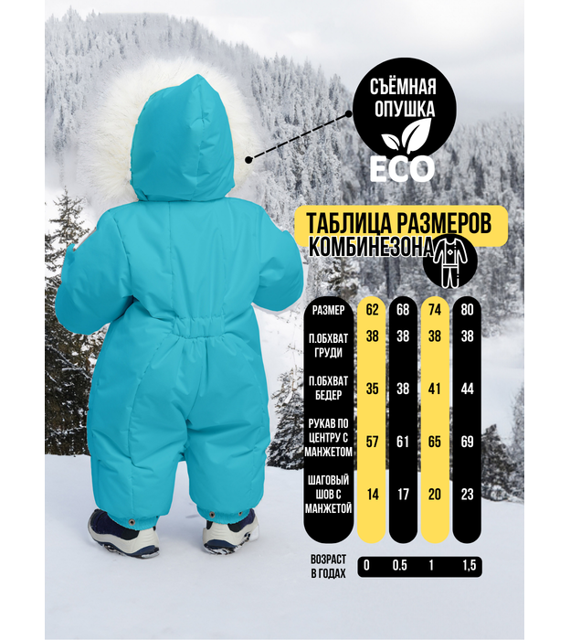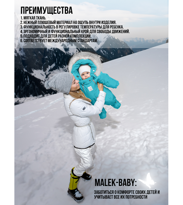 Функциональные изделия для комфорта Отвороты на рукавах заменяют варежки, капюшон на резинке защищает голову от сквозняков и холода, съемные пинетки не сползают и легко крепятся.