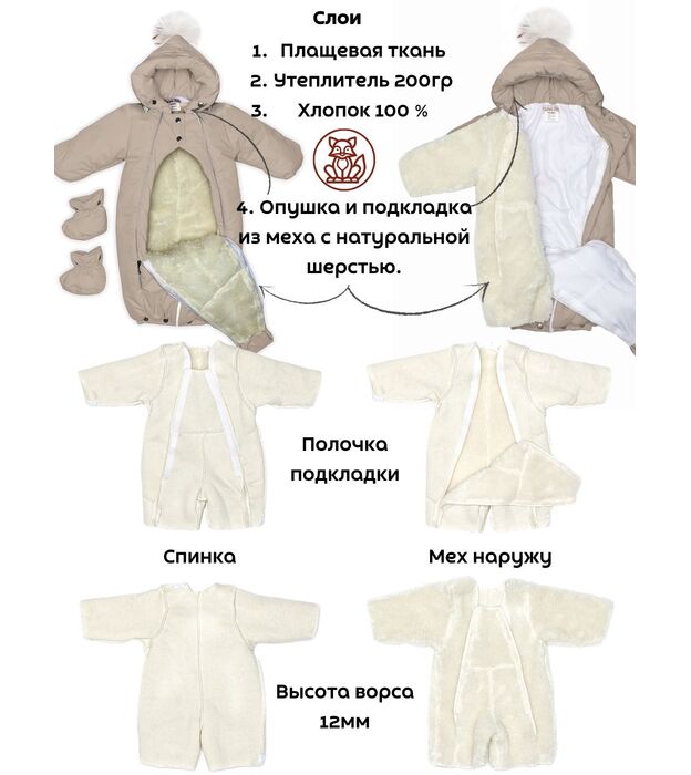 Комбинезон - трансформер детский, зимний. Изготовлен, из водонепроницаемого, не продуваемого, сверхпрочного материала и утеплен съемной подкладкой, в составе которой натуральная овечья шерсть. В зависимости от возраста вашего малыша и погодных условий вы можете использовать изделие как конверт или комбинезон. В режиме конверт модель идеальна для новорожденных, позволяет не тревожить малыша при одевании и раздевании во время сна, при желании с помощью молнии конверт легко трансформируется в комбинезон. Когда потеплеет, вы можете снять шерстяную подкладку, и комбинезон подойдет для весенней погоды. Отвороты на рукавах заменяют варежки, которые согреют маленькие ручки вашего малыша в холодную погоду. Защитная планка и плотно прилегающий к голове капюшон со съемной опушкой из натурального меха защитит от сильного ветра за счет вшитой утягивающей резинки. Цветовая гамма опушки возможна в кофейном, либо белом варианте. В комплекте отстегивающиеся пинетки.