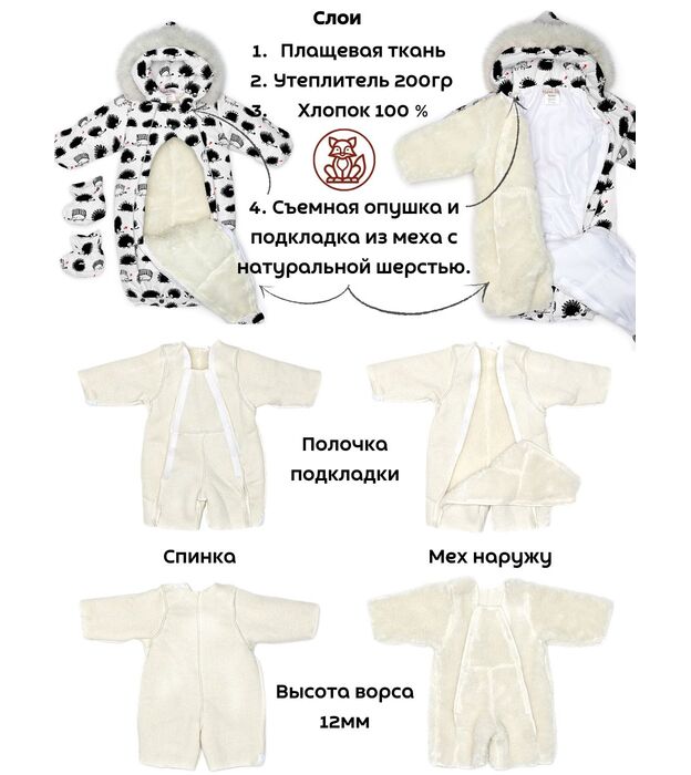 верх-100%пэ, утеплитель синтепон 200гр, подстежка съемная с содержанием шерсти 10%