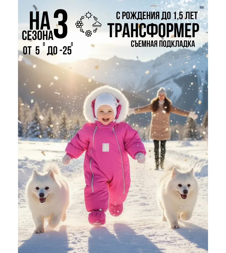 Функциональные изделия для комфорта Отвороты на рукавах заменяют варежки, капюшон на резинке защищает голову от сквозняков и холода, съемные пинетки не сползают и легко крепятся.