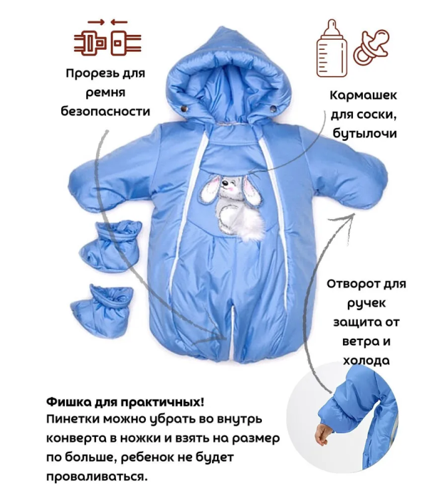 • Комбинезон-трансформер 2 в 1: легко превращается из конверта для новорождённых в полноценный комбинезон.