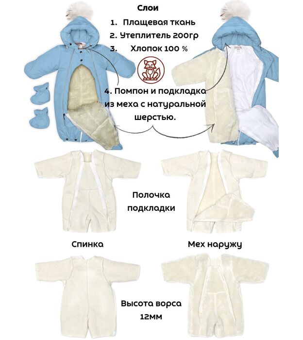 Комбинезон - трансформер детский, зимний. Изготовлен, из водонепроницаемого, не продуваемого, сверхпрочного материала и утеплен съемной подкладкой, в составе которой натуральная овечья шерсть. В зависимости от возраста вашего малыша и погодных условий вы можете использовать изделие как конверт или комбинезон. В режиме конверт модель идеальна для новорожденных, позволяет не тревожить малыша при одевании и раздевании во время сна, при желании с помощью молнии конверт легко трансформируется в комбинезон. Когда потеплеет, вы можете снять шерстяную подкладку, и комбинезон подойдет для весенней погоды. Отвороты на рукавах заменяют варежки, которые согреют маленькие ручки вашего малыша в холодную погоду. Защитная планка и плотно прилегающий к голове капюшон со съемной опушкой из натурального меха защитит от сильного ветра за счет вшитой утягивающей резинки. Цветовая гамма опушки возможна в кофейном, либо белом варианте. В комплекте отстегивающиеся пинетки.