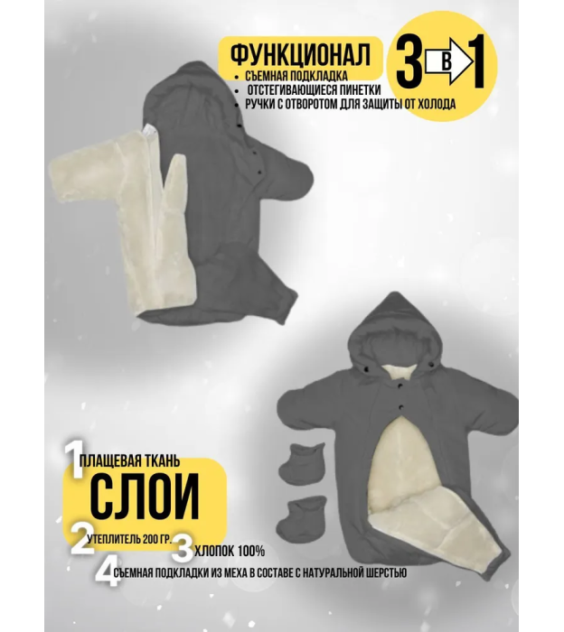 Комбинезон-трансформер детский зимний. Изготовлен из водонепроницаемого, не продуваемого, сверхпрочного материала и утеплен съемной подкладкой, в составе которой натуральная овечья шерсть. Он прослужит вашему малышу не один сезон, в зависимости от возраста вашего малыша и погодных условий вы можете использовать изделие как конверт или комбинезон. В режиме конверт модель идеальна для новорожденных, позволяет не тревожить малыша при одевании и раздевании во время сна, при желании с помощью молнии конверт легко трансформируется в комбинезон. Когда потеплеет, вы можете снять шерстяную подкладку, и комбинезон подойдет для весенней погоды. Отвороты на рукавах заменяют варежки, которые согреют маленькие ручки вашего малыша в холодную погоду. Плотно прилегающий к голове капюшон защитит от сильного ветра за счет вшитой утягивающей резинки. В комплекте идут отстегивающиеся пинетки, которые, будут греть ножки, и не будут выделяться из общего стиля.