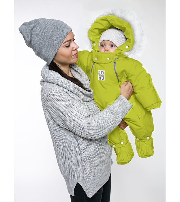 - Функциональные детали для комфорта Отвороты на рукавах заменяют варежки, капюшон на резинке защищает голову от сквозняков и холода, съемные пинетки не сползают и легко крепятся.