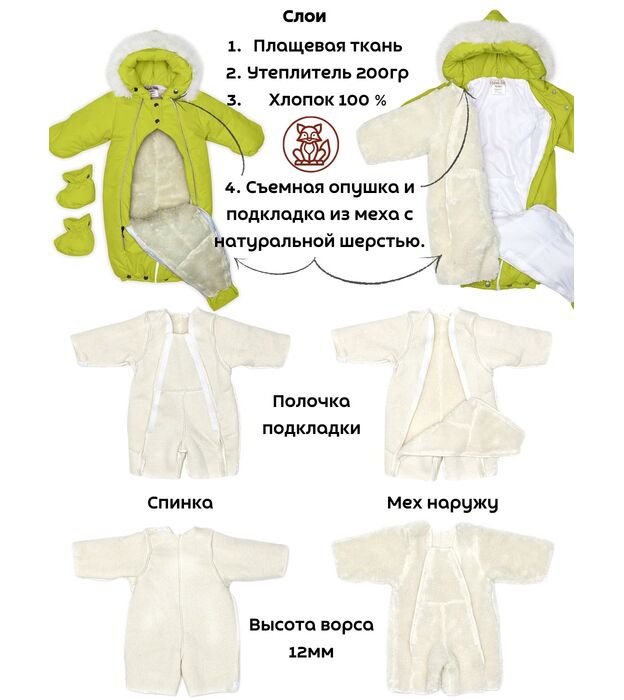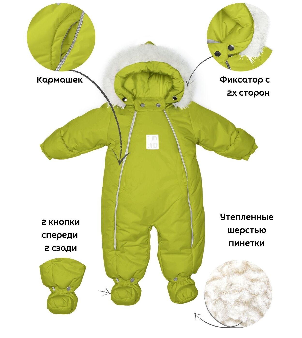 Функциональные изделия для комфорта Отвороты на рукавах заменяют варежки, капюшон на резинке защищает голову от сквозняков и холода, съемные пинетки не сползают и легко крепятся.