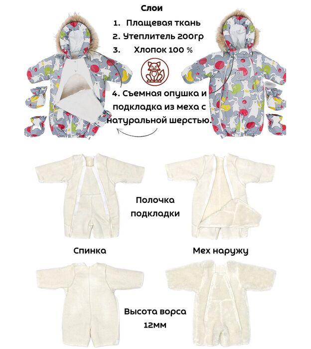 верх-100%пэ, утеплитель синтепон 200гр, подстежка съемная с содержанием шерсти 10%