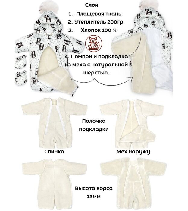 Комбинезон - трансформер детский, зимний. Изготовлен, из водонепроницаемого, не продуваемого, сверхпрочного материала и утеплен съемной подкладкой, в составе которой натуральная овечья шерсть. В зависимости от возраста вашего малыша и погодных условий вы можете использовать изделие как конверт или комбинезон. В режиме конверт модель идеальна для новорожденных, позволяет не тревожить малыша при одевании и раздевании во время сна, при желании с помощью молнии конверт легко трансформируется в комбинезон. Когда потеплеет, вы можете снять шерстяную подкладку, и комбинезон подойдет для весенней погоды. Отвороты на рукавах заменяют варежки, которые согреют маленькие ручки вашего малыша в холодную погоду. Защитная планка и плотно прилегающий к голове капюшон со съемной опушкой из натурального меха защитит от сильного ветра за счет вшитой утягивающей резинки. Цветовая гамма опушки возможна в кофейном, либо белом варианте. В комплекте отстегивающиеся пинетки.