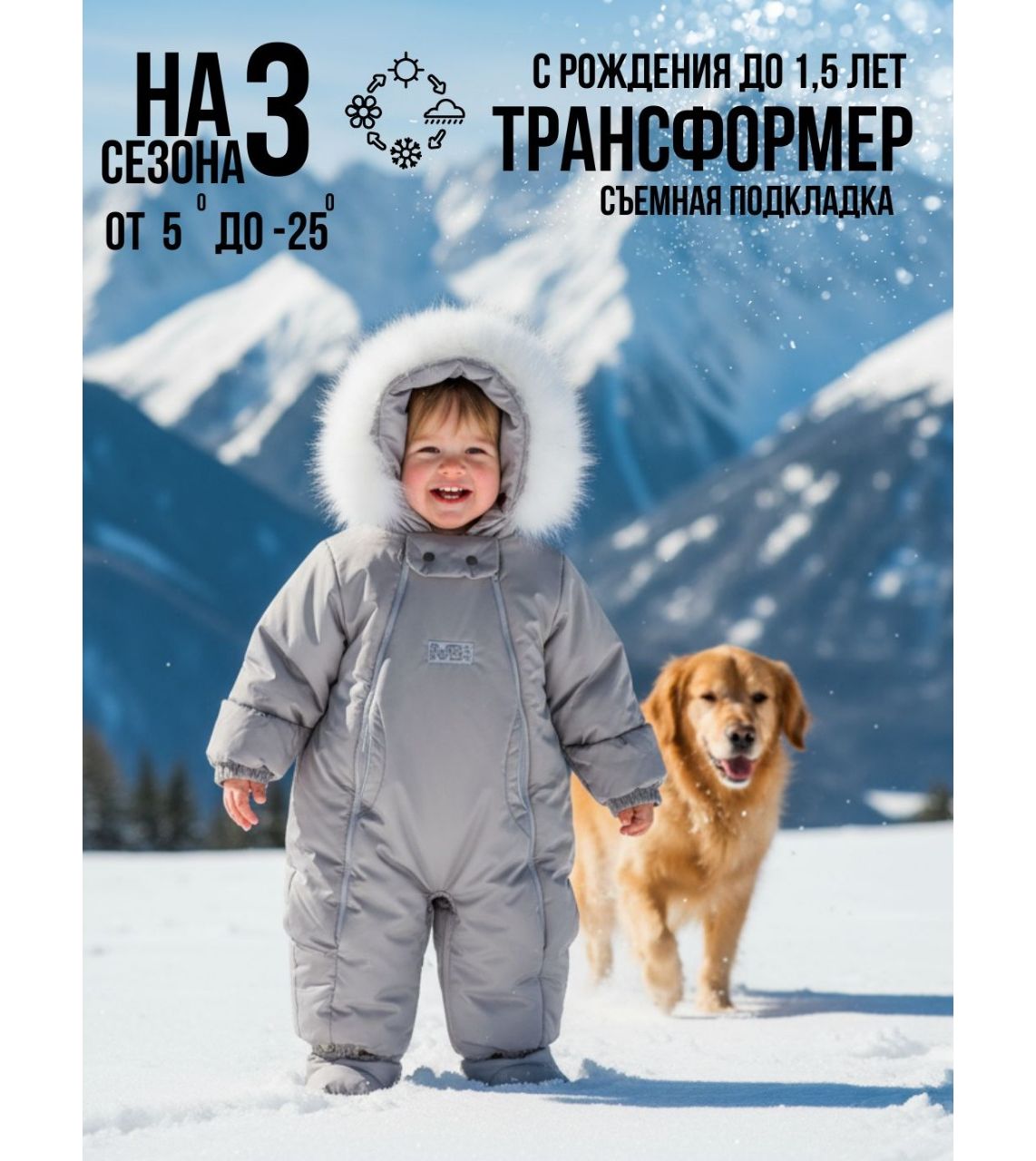 - Функциональные детали для комфорта Отвороты на рукавах заменяют варежки, капюшон на резинке защищает голову от сквозняков и холода, съемные пинетки не сползают и легко крепятся.
