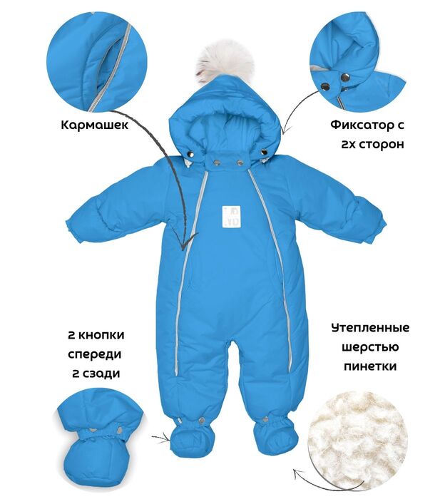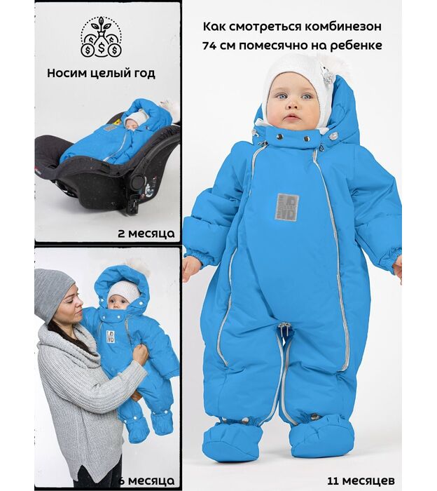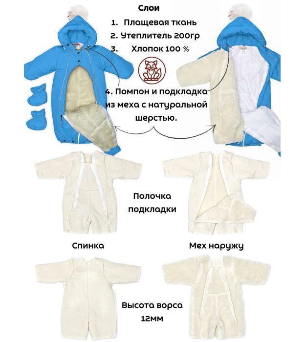 Комбинезон - трансформер детский, зимний. Изготовлен, из водонепроницаемого, не продуваемого, сверхпрочного материала и утеплен съемной подкладкой, в составе которой натуральная овечья шерсть. В зависимости от возраста вашего малыша и погодных условий вы можете использовать изделие как конверт или комбинезон. В режиме конверт модель идеальна для новорожденных, позволяет не тревожить малыша при одевании и раздевании во время сна, при желании с помощью молнии конверт легко трансформируется в комбинезон. Когда потеплеет, вы можете снять шерстяную подкладку, и комбинезон подойдет для весенней погоды. Отвороты на рукавах заменяют варежки, которые согреют маленькие ручки вашего малыша в холодную погоду. Защитная планка и плотно прилегающий к голове капюшон со съемной опушкой из натурального меха защитит от сильного ветра за счет вшитой утягивающей резинки. Цветовая гамма опушки возможна в кофейном, либо белом варианте. В комплекте отстегивающиеся пинетки.