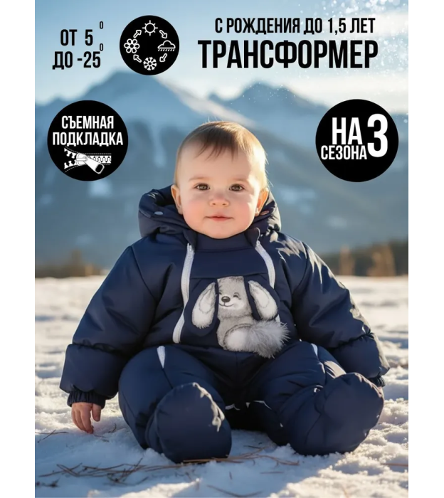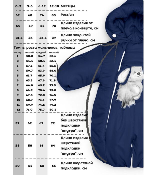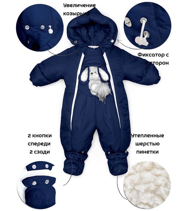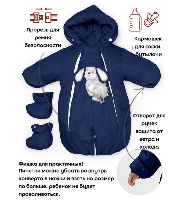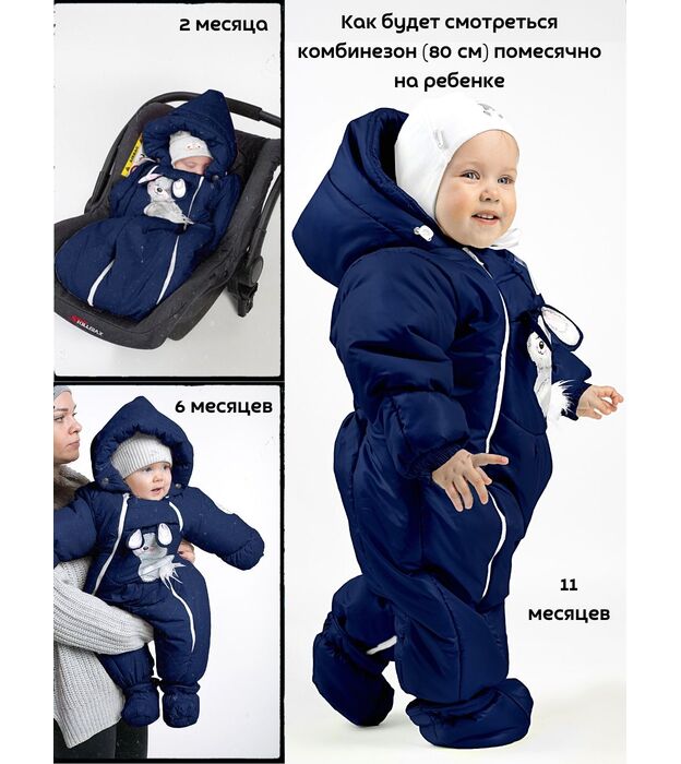 Комбинезон-трансформер детский зимний. Изготовлен из водонепроницаемого, не продуваемого, сверхпрочного материала и утеплен съемной подкладкой, в составе которой натуральная овечья шерсть. Он прослужит вашему малышу не один сезон, в зависимости от возраста вашего малыша и погодных условий вы можете использовать изделие как конверт или комбинезон. В режиме конверт модель идеальна для новорожденных, позволяет не тревожить малыша при одевании и раздевании во время сна, при желании с помощью молнии конверт легко трансформируется в комбинезон. Когда потеплеет, вы можете снять шерстяную подкладку, и комбинезон подойдет для весенней погоды. Отвороты на рукавах заменяют варежки, которые согреют маленькие ручки вашего малыша в холодную погоду. Плотно прилегающий к голове капюшон защитит от сильного ветра за счет вшитой утягивающей резинки. В комплекте идут отстегивающиеся пинетки, которые, будут греть ножки, и не будут выделяться из общего стиля.