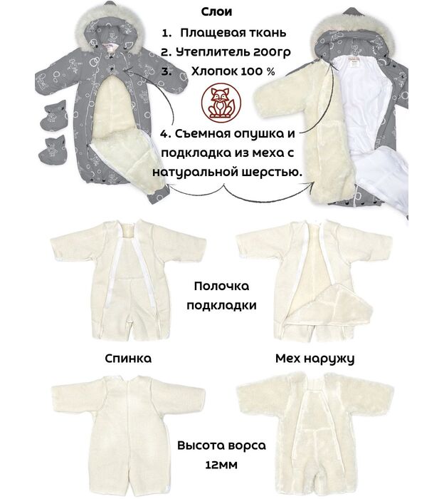 Комбинезон - трансформер детский, зимний. Изготовлен, из водонепроницаемого, не продуваемого, сверхпрочного материала и утеплен съемной подкладкой, в составе которой натуральная овечья шерсть. В зависимости от возраста вашего малыша и погодных условий вы можете использовать изделие как конверт или комбинезон. В режиме конверт модель идеальна для новорожденных, позволяет не тревожить малыша при одевании и раздевании во время сна, при желании с помощью молнии конверт легко трансформируется в комбинезон. Когда потеплеет, вы можете снять шерстяную подкладку, и комбинезон подойдет для весенней погоды. Отвороты на рукавах заменяют варежки, которые согреют маленькие ручки вашего малыша в холодную погоду. Защитная планка и плотно прилегающий к голове капюшон со съемной опушкой из натурального меха защитит от сильного ветра за счет вшитой утягивающей резинки. Цветовая гамма опушки возможна в кофейном, либо белом варианте. В комплекте отстегивающиеся пинетки.