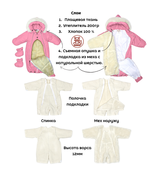 Комбинезон - трансформер детский, зимний. Изготовлен, из водонепроницаемого, не продуваемого, сверхпрочного материала и утеплен съемной подкладкой, в составе которой натуральная овечья шерсть. В зависимости от возраста вашего малыша и погодных условий вы можете использовать изделие как конверт или комбинезон. В режиме конверт модель идеальна для новорожденных, позволяет не тревожить малыша при одевании и раздевании во время сна, при желании с помощью молнии конверт легко трансформируется в комбинезон. Когда потеплеет, вы можете снять шерстяную подкладку, и комбинезон подойдет для весенней погоды. Отвороты на рукавах заменяют варежки, которые согреют маленькие ручки вашего малыша в холодную погоду. Защитная планка и плотно прилегающий к голове капюшон со съемной опушкой из натурального меха защитит от сильного ветра за счет вшитой утягивающей резинки. Цветовая гамма опушки возможна в кофейном, либо белом варианте. В комплекте отстегивающиеся пинетки.