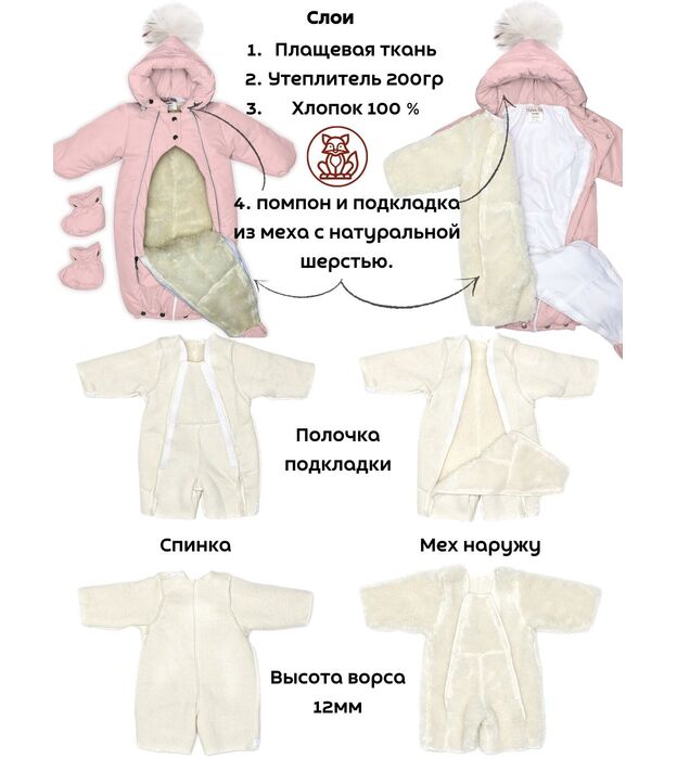 верх-100%пэ, утеплитель синтепон 200гр, подстежка съемная с содержанием шерсти 10%
