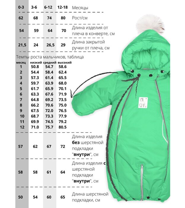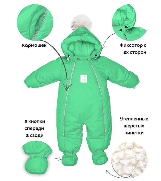 Комбинезон - трансформер детский, зимний. Изготовлен, из водонепроницаемого, не продуваемого, сверхпрочного материала и утеплен съемной подкладкой, в составе которой натуральная овечья шерсть. В зависимости от возраста вашего малыша и погодных условий вы можете использовать изделие как конверт или комбинезон. В режиме конверт модель идеальна для новорожденных, позволяет не тревожить малыша при одевании и раздевании во время сна, при желании с помощью молнии конверт легко трансформируется в комбинезон. Когда потеплеет, вы можете снять шерстяную подкладку, и комбинезон подойдет для весенней погоды. Отвороты на рукавах заменяют варежки, которые согреют маленькие ручки вашего малыша в холодную погоду. Защитная планка и плотно прилегающий к голове капюшон со съемной опушкой из натурального меха защитит от сильного ветра за счет вшитой утягивающей резинки. Цветовая гамма опушки возможна в кофейном, либо белом варианте. В комплекте отстегивающиеся пинетки.