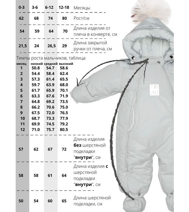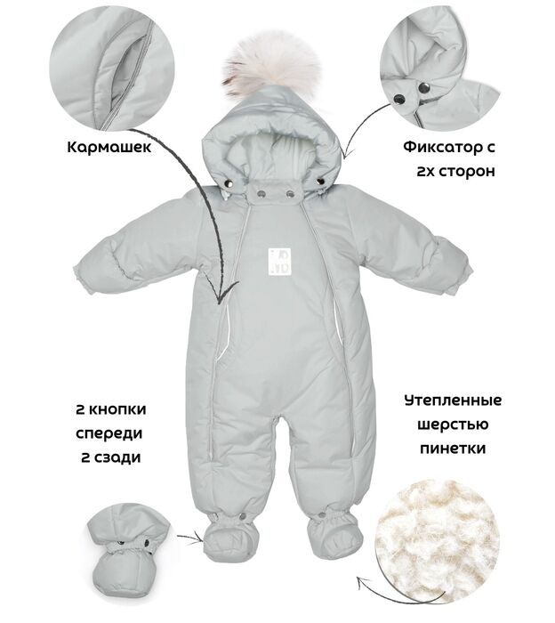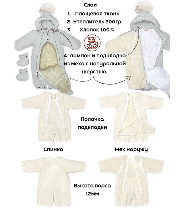 Комбинезон - трансформер детский, зимний. Изготовлен, из водонепроницаемого, не продуваемого, сверхпрочного материала и утеплен съемной подкладкой, в составе которой натуральная овечья шерсть. В зависимости от возраста вашего малыша и погодных условий вы можете использовать изделие как конверт или комбинезон. В режиме конверт модель идеальна для новорожденных, позволяет не тревожить малыша при одевании и раздевании во время сна, при желании с помощью молнии конверт легко трансформируется в комбинезон. Когда потеплеет, вы можете снять шерстяную подкладку, и комбинезон подойдет для весенней погоды. Отвороты на рукавах заменяют варежки, которые согреют маленькие ручки вашего малыша в холодную погоду. Защитная планка и плотно прилегающий к голове капюшон со съемной опушкой из натурального меха защитит от сильного ветра за счет вшитой утягивающей резинки. Цветовая гамма опушки возможна в кофейном, либо белом варианте. В комплекте отстегивающиеся пинетки.