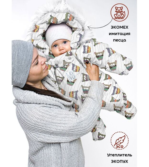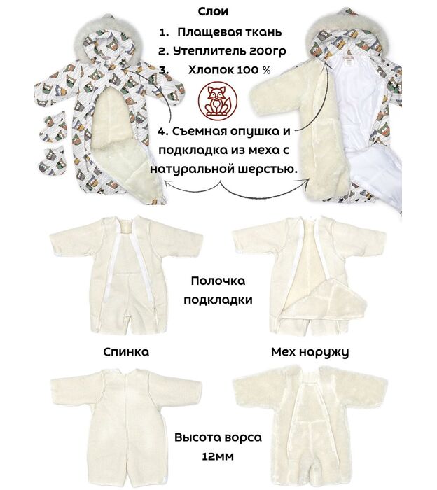 Комбинезон - трансформер детский, зимний. Изготовлен, из водонепроницаемого, не продуваемого, сверхпрочного материала и утеплен съемной подкладкой, в составе которой натуральная овечья шерсть. В зависимости от возраста вашего малыша и погодных условий вы можете использовать изделие как конверт или комбинезон. В режиме конверт модель идеальна для новорожденных, позволяет не тревожить малыша при одевании и раздевании во время сна, при желании с помощью молнии конверт легко трансформируется в комбинезон. Когда потеплеет, вы можете снять шерстяную подкладку, и комбинезон подойдет для весенней погоды. Отвороты на рукавах заменяют варежки, которые согреют маленькие ручки вашего малыша в холодную погоду. Защитная планка и плотно прилегающий к голове капюшон со съемной опушкой из натурального меха защитит от сильного ветра за счет вшитой утягивающей резинки. Цветовая гамма опушки возможна в кофейном, либо белом варианте. В комплекте отстегивающиеся пинетки.