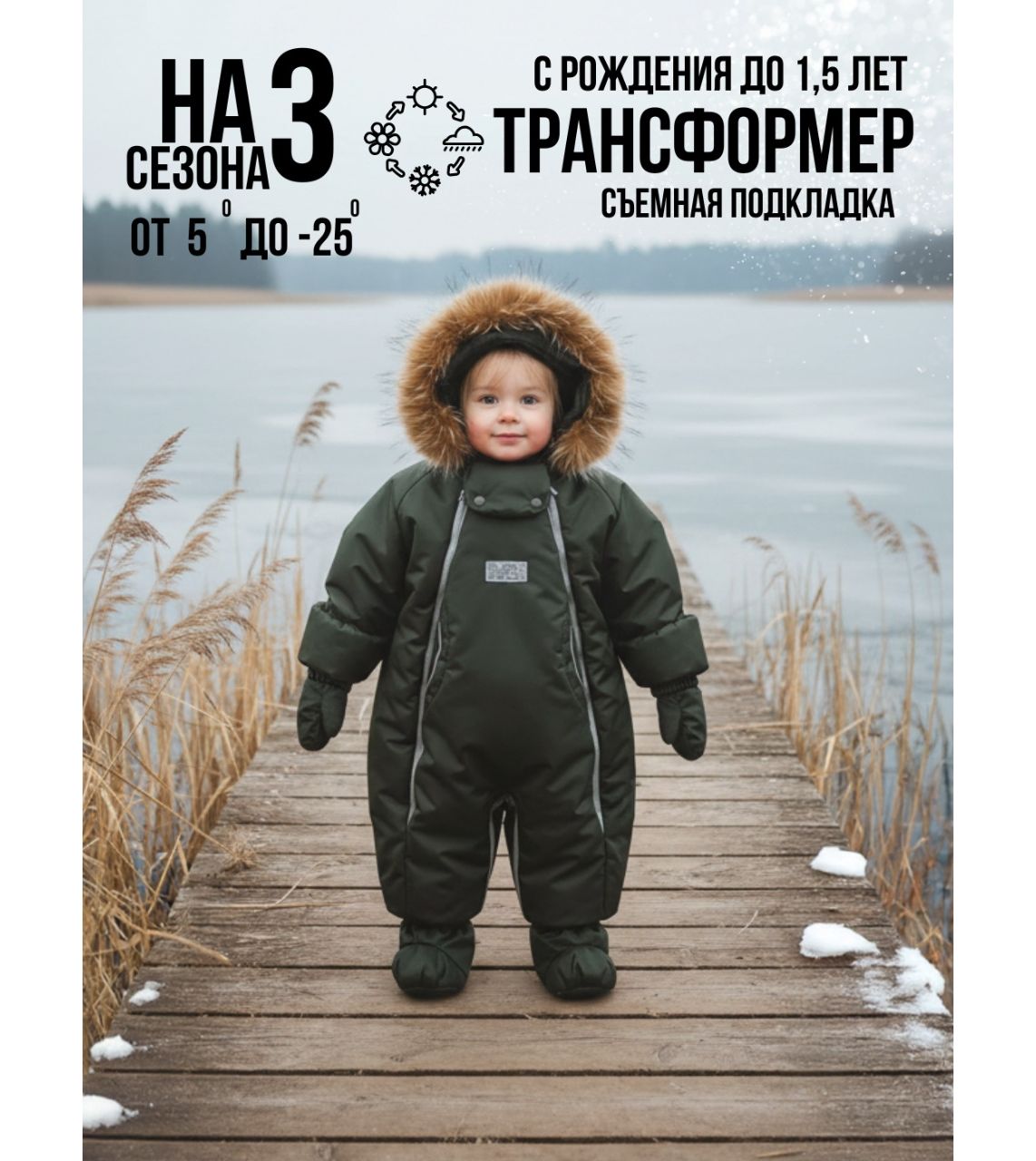 Функциональные изделия для комфорта Отвороты на рукавах заменяют варежки, капюшон на резинке защищает голову от сквозняков и холода, съемные пинетки не сползают и легко крепятся.