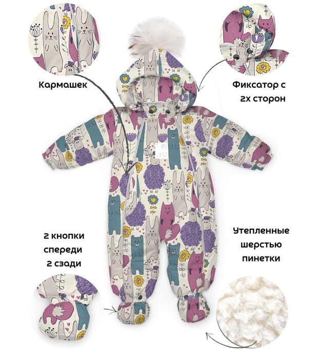 Комбинезон - трансформер детский, зимний. Изготовлен, из водонепроницаемого, не продуваемого, сверхпрочного материала и утеплен съемной подкладкой, в составе которой натуральная овечья шерсть. В зависимости от возраста вашего малыша и погодных условий вы можете использовать изделие как конверт или комбинезон. В режиме конверт модель идеальна для новорожденных, позволяет не тревожить малыша при одевании и раздевании во время сна, при желании с помощью молнии конверт легко трансформируется в комбинезон. Когда потеплеет, вы можете снять шерстяную подкладку, и комбинезон подойдет для весенней погоды. Отвороты на рукавах заменяют варежки, которые согреют маленькие ручки вашего малыша в холодную погоду. Защитная планка и плотно прилегающий к голове капюшон со съемной опушкой из натурального меха защитит от сильного ветра за счет вшитой утягивающей резинки. Цветовая гамма опушки возможна в кофейном, либо белом варианте. В комплекте отстегивающиеся пинетки.