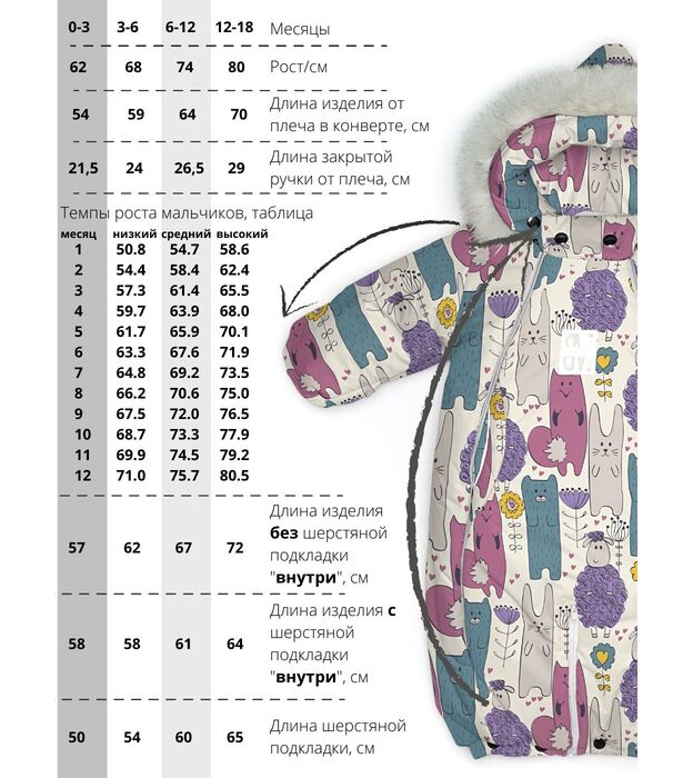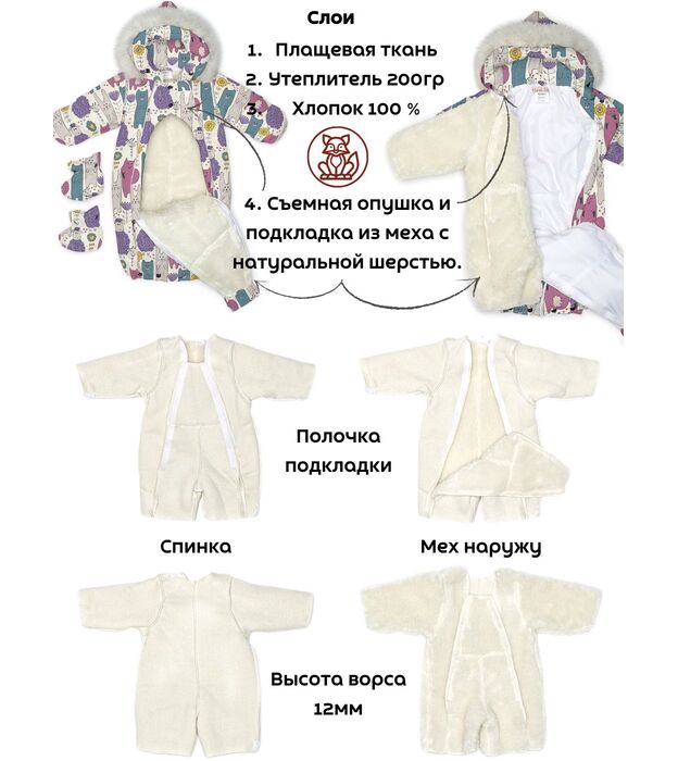 Комбинезон - трансформер детский, зимний. Изготовлен, из водонепроницаемого, не продуваемого, сверхпрочного материала и утеплен съемной подкладкой, в составе которой натуральная овечья шерсть. В зависимости от возраста вашего малыша и погодных условий вы можете использовать изделие как конверт или комбинезон. В режиме конверт модель идеальна для новорожденных, позволяет не тревожить малыша при одевании и раздевании во время сна, при желании с помощью молнии конверт легко трансформируется в комбинезон. Когда потеплеет, вы можете снять шерстяную подкладку, и комбинезон подойдет для весенней погоды. Отвороты на рукавах заменяют варежки, которые согреют маленькие ручки вашего малыша в холодную погоду. Защитная планка и плотно прилегающий к голове капюшон со съемной опушкой из натурального меха защитит от сильного ветра за счет вшитой утягивающей резинки. Цветовая гамма опушки возможна в кофейном, либо белом варианте. В комплекте отстегивающиеся пинетки.