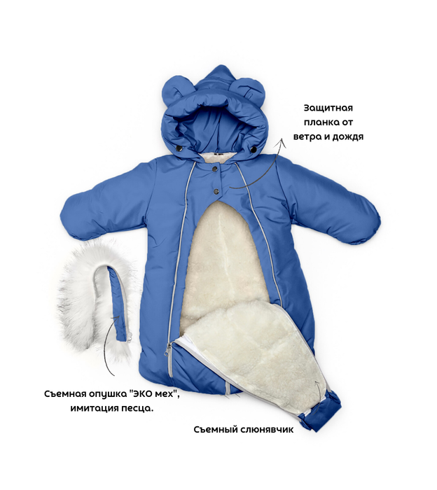 Комбинезон конверт зимний в коляску для новорожденных MaLeK BaBy. Конверт в коляску зимний изготовлен из водонепроницаемого, не продуваемого, сверхпрочного материала и утеплен съемной подкладкой, в составе которой натуральная овечья шерсть. Зимний конверт для новорожденных вы можете использовать и как комбинезон. Транформер в режиме конверт зимний подойдет в автокресло или коляску модель идеальна как для новорожденных так взрослее, позволяет не тревожить малыша при одевании и раздевании во время сна, при желании с помощью молнии конверт легко трансформируется в комбинезон. Вы можете снять шерстяную подкладку и сделать комбинезон детский зимний для о осени. Отвороты заменяют варежки, которые согреют маленькие ручки вашего малыша в холодную погоду. Защитная планка зимнего конверта и плотно прилегающий к голове капюшон со съемной опушкой из натурального меха защитит от сильного ветра за счет вшитой утягивающей резинки. В комплекте с зимним конвертом идут отстегивающиеся пинетки и варежки