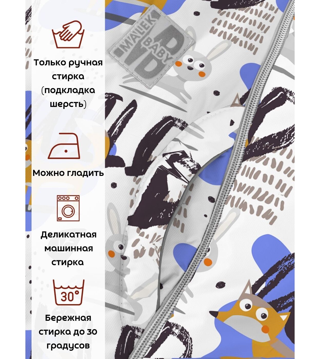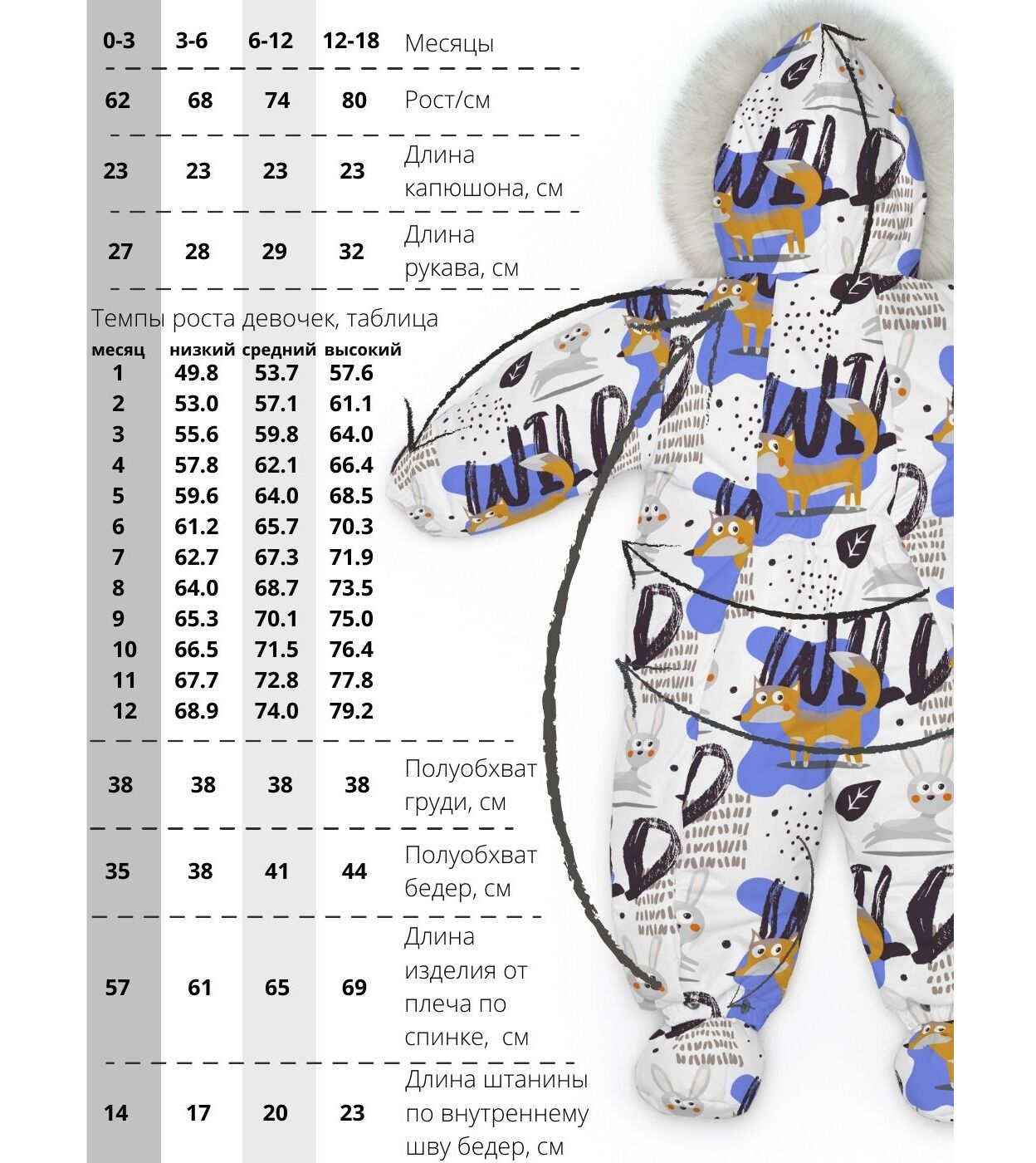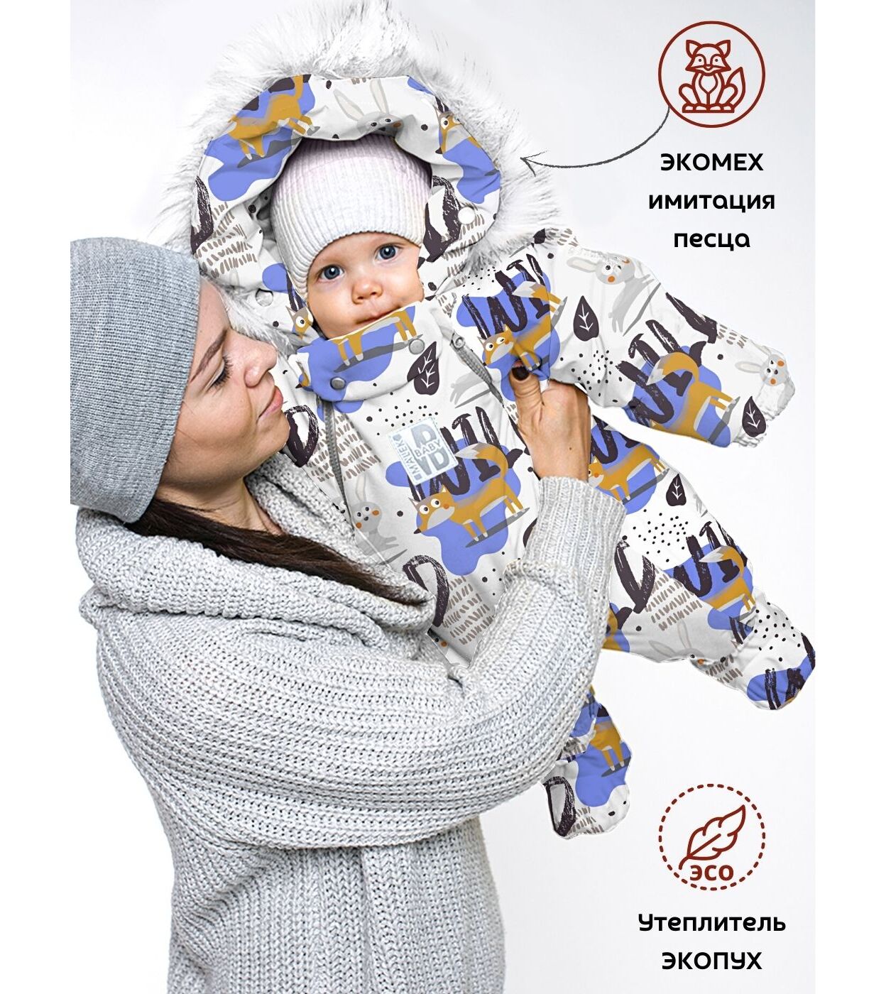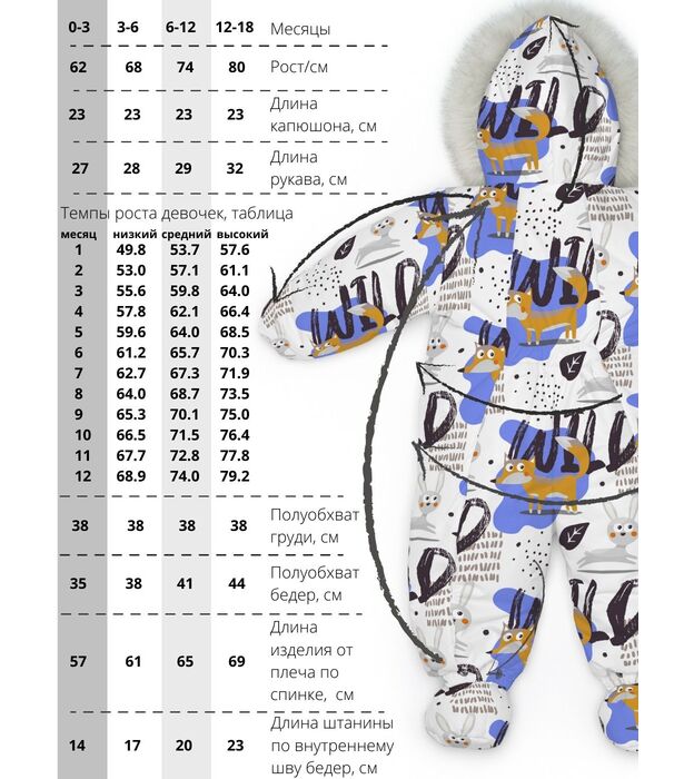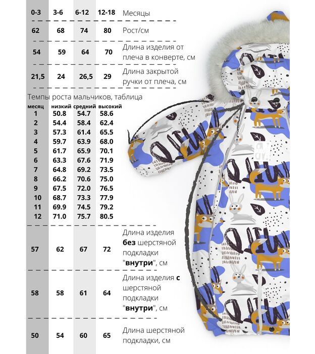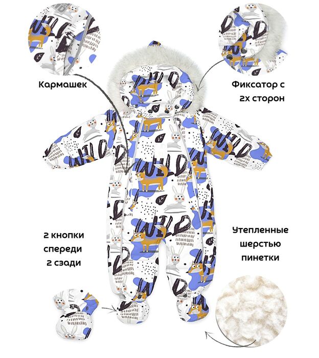 Функциональные изделия для комфорта Отвороты на рукавах заменяют варежки, капюшон на резинке защищает голову от сквозняков и холода, съемные пинетки не сползают и легко крепятся.