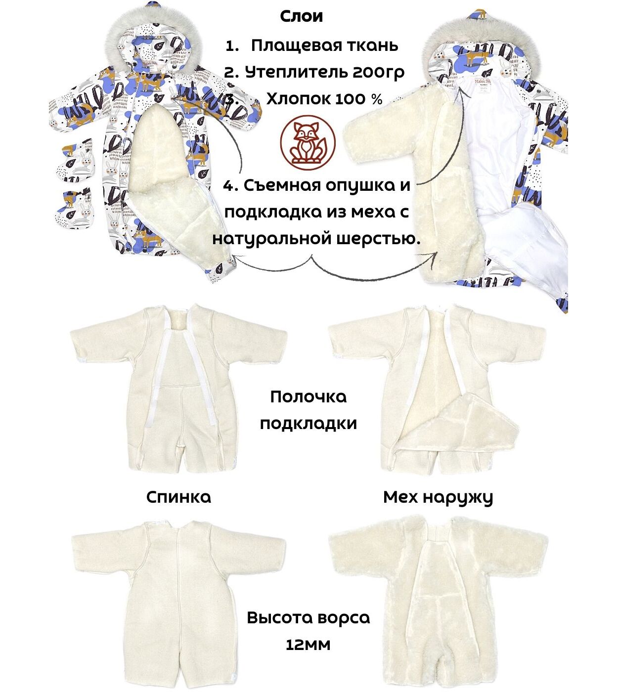 верх-100%пэ, утеплитель синтепон 200гр, подстежка съемная с содержанием шерсти 10%
