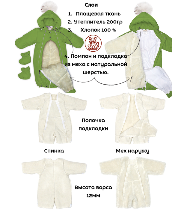 верх-100%пэ, утеплитель синтепон 200гр, подстежка съемная с содержанием шерсти 10%