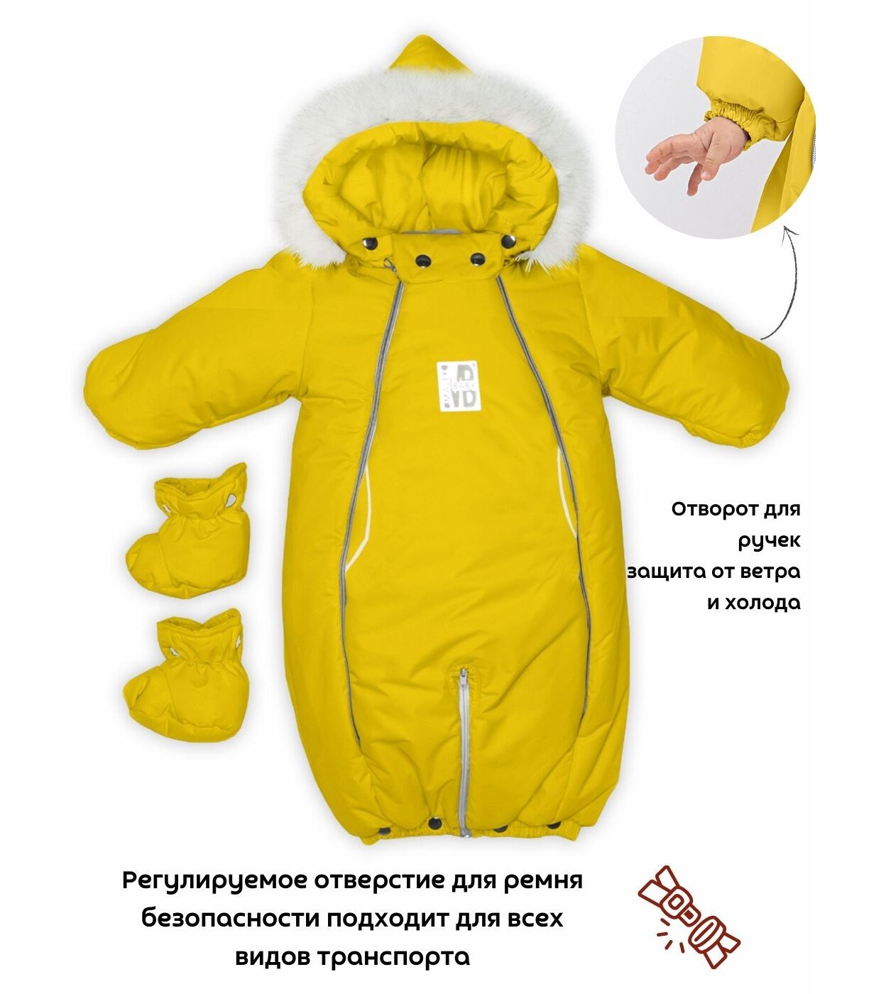 Комбинезон - трансформер детский, зимний. Изготовлен, из водонепроницаемого, не продуваемого, сверхпрочного материала и утеплен съемной подкладкой, в составе которой натуральная овечья шерсть. В зависимости от возраста вашего малыша и погодных условий вы можете использовать изделие как конверт или комбинезон. В режиме конверт модель идеальна для новорожденных, позволяет не тревожить малыша при одевании и раздевании во время сна, при желании с помощью молнии конверт легко трансформируется в комбинезон. Когда потеплеет, вы можете снять шерстяную подкладку, и комбинезон подойдет для весенней погоды. Отвороты на рукавах заменяют варежки, которые согреют маленькие ручки вашего малыша в холодную погоду. Защитная планка и плотно прилегающий к голове капюшон со съемной опушкой из натурального меха защитит от сильного ветра за счет вшитой утягивающей резинки. Цветовая гамма опушки возможна в кофейном, либо белом варианте. В комплекте отстегивающиеся пинетки.