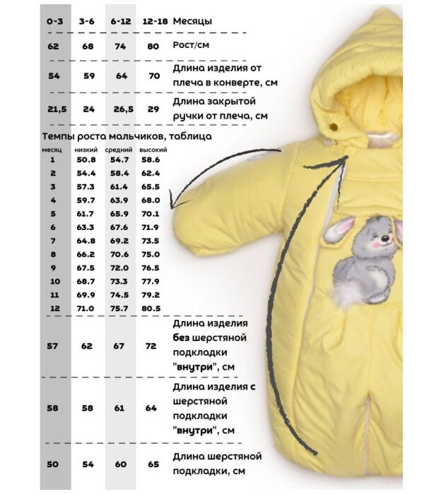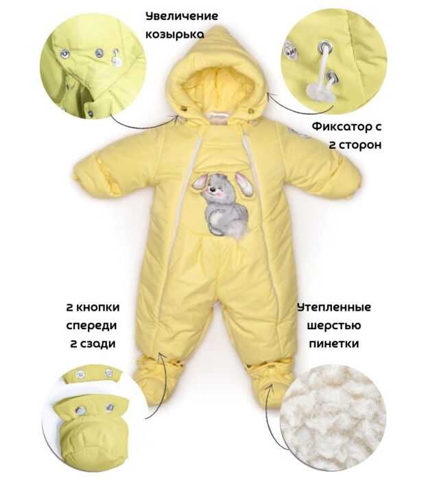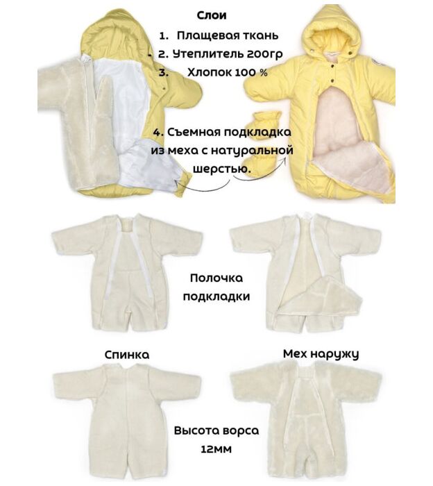 Комбинезон-трансформер детский зимний. Изготовлен из водонепроницаемого, не продуваемого, сверхпрочного материала и утеплен съемной подкладкой, в составе которой натуральная овечья шерсть. Он прослужит вашему малышу не один сезон, в зависимости от возраста вашего малыша и погодных условий вы можете использовать изделие как конверт или комбинезон. В режиме конверт модель идеальна для новорожденных, позволяет не тревожить малыша при одевании и раздевании во время сна, при желании с помощью молнии конверт легко трансформируется в комбинезон. Когда потеплеет, вы можете снять шерстяную подкладку, и комбинезон подойдет для весенней погоды. Отвороты на рукавах заменяют варежки, которые согреют маленькие ручки вашего малыша в холодную погоду. Плотно прилегающий к голове капюшон защитит от сильного ветра за счет вшитой утягивающей резинки. В комплекте идут отстегивающиеся пинетки, которые, будут греть ножки, и не будут выделяться из общего стиля.