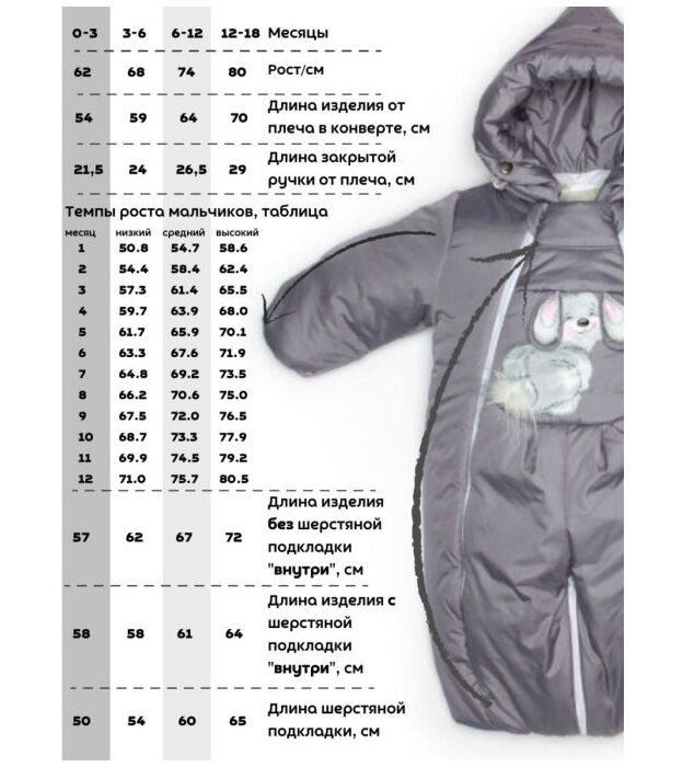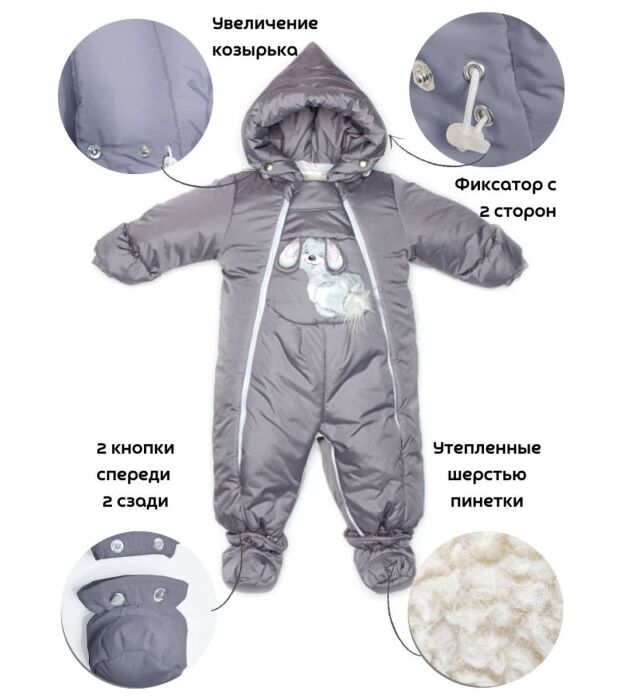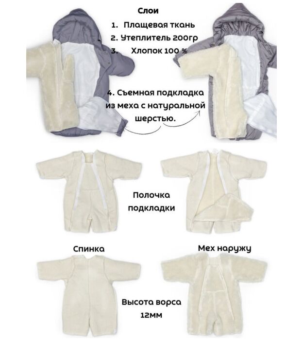 Комбинезон-трансформер детский зимний. Изготовлен из водонепроницаемого, не продуваемого, сверхпрочного материала и утеплен съемной подкладкой, в составе которой натуральная овечья шерсть. Он прослужит вашему малышу не один сезон, в зависимости от возраста вашего малыша и погодных условий вы можете использовать изделие как конверт или комбинезон. В режиме конверт модель идеальна для новорожденных, позволяет не тревожить малыша при одевании и раздевании во время сна, при желании с помощью молнии конверт легко трансформируется в комбинезон. Когда потеплеет, вы можете снять шерстяную подкладку, и комбинезон подойдет для весенней погоды. Отвороты на рукавах заменяют варежки, которые согреют маленькие ручки вашего малыша в холодную погоду. Плотно прилегающий к голове капюшон защитит от сильного ветра за счет вшитой утягивающей резинки. В комплекте идут отстегивающиеся пинетки, которые, будут греть ножки, и не будут выделяться из общего стиля.