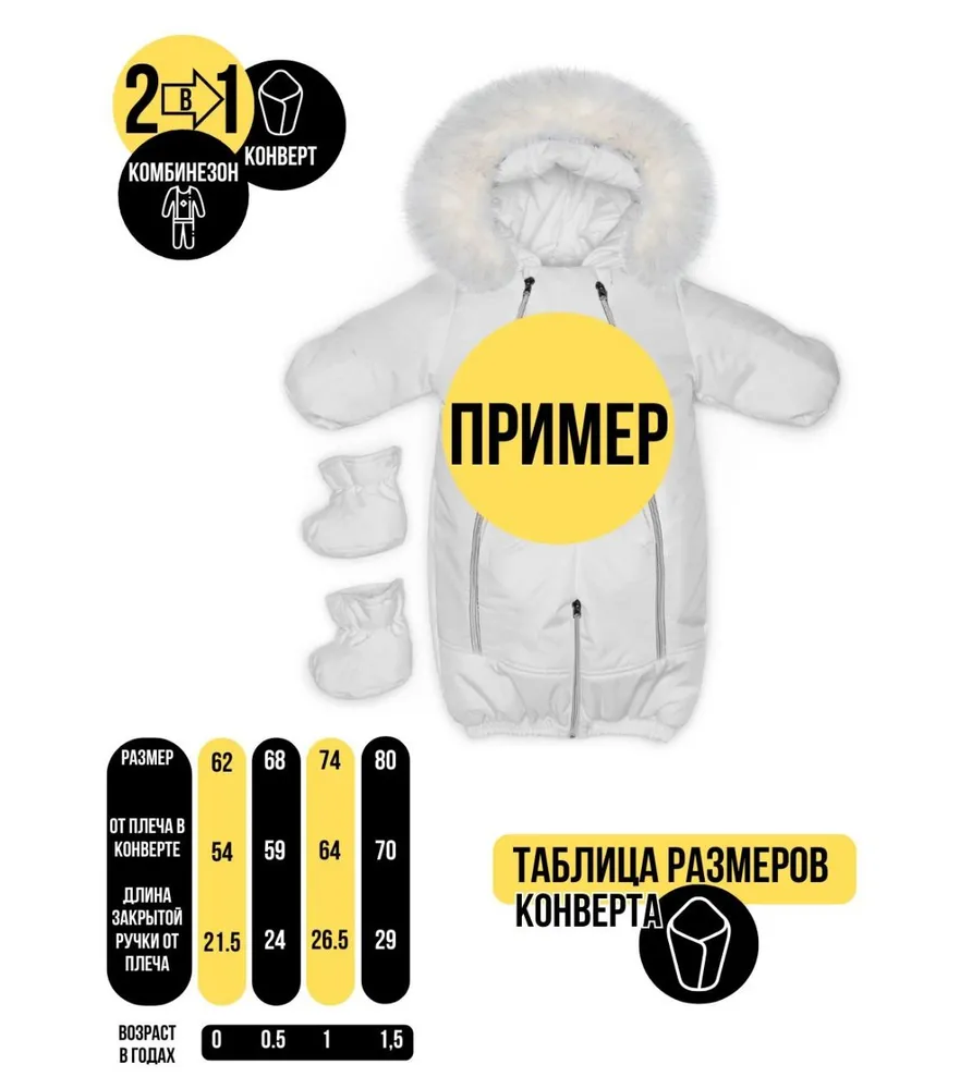 Детский комбинезон-трансформер MaLeK BaBy — идеальное решение для новорождённых и малышей от 0 до 18 месяцев Откройте для себя идеальное сочетание функциональности, тепла и стиля в зимнем комбинезоне-трансформере MaLeK BaBy — созданном специально для новорождённых, чтобы защищать вашего малыша от непогоды с первых дней жизни. Этот комбинезон подходит для использования в течение трёх сезонов, благодаря продуманной системе трансформации и премиальным материалам. Особенности и преимущества: Температурный режим: от +5 до -25°C — идеален как зимний комбинезон, так и демисезонный комбинезон для новорожденных; Мембранная ткань – прочная, ветрозащитная, влагостойкая и при этом «дышащая»; Съёмная шерстяная подкладка – тёплая, дышащая, подходит для морозной зимы и легко снимается в межсезонье; Съёмные пинетки – защищают ножки от холода, легко отстёгиваются в помещении или в тёплую погоду; Отвороты на рукавах — позволяют обойтись без варежек, надёжно закрывая ручки; Капюшон с ушками и съёмной опушкой — милый дизайн и дополнительная защита от ветра; Светоотражающие элементы — повышают безопасность малыша в условиях плохой видимости; Каждое изделие проходит проверку качества — надёжность, безопасность и внимание к каждой детали. Механизм трансформации Комбинезон MaLeK BaBy — это универсальное 2-в-1 решение, которое с лёгкостью превращается из утеплённого зимнего комбинезона в демисезонный вариант: В зимнем варианте используется съёмная подкладка с натуральным шерстяным волокном — идеальный выбор для температуры до -25°С. Весной и осенью подкладка легко извлекается, и комбинезон становится лёгким и комфортным даже при +5°C. Съёмные пинетки и возможность трансформации ножек с помощью молний позволяют быстро адаптировать изделие под обувь или использовать как конверт-комбинезон трансформер — удобно как для прогулок, так и для сна малыша. Молнии на ножках позволяют быстро расстегнуть низ и трансформировать комбинезон в классический конверт или облегчённую модель без ножек. Это особенно удобно в коляске, на переодевании или при смене погоды. Назначение и аудитория Комбинезон-трансформер MaLeK BaBy идеально подойдёт: для новорожденных и детей до 18 месяцев; как первый зимний комбинезон для малыша; для родителей, ищущих детские комбинезоны трансформеры, совмещающие стиль и практичность; для тех, кто хочет купить комбинезон трансформер зимний с возможностью ношения в межсезонье. Почему выбирают MaLeK BaBy: Безопасность и проверенное качество; Высокотехнологичные материалы и пошив; Изысканный внешний вид с капюшоном-«ушки»; Производство с учётом потребностей российских родителей и климата.
