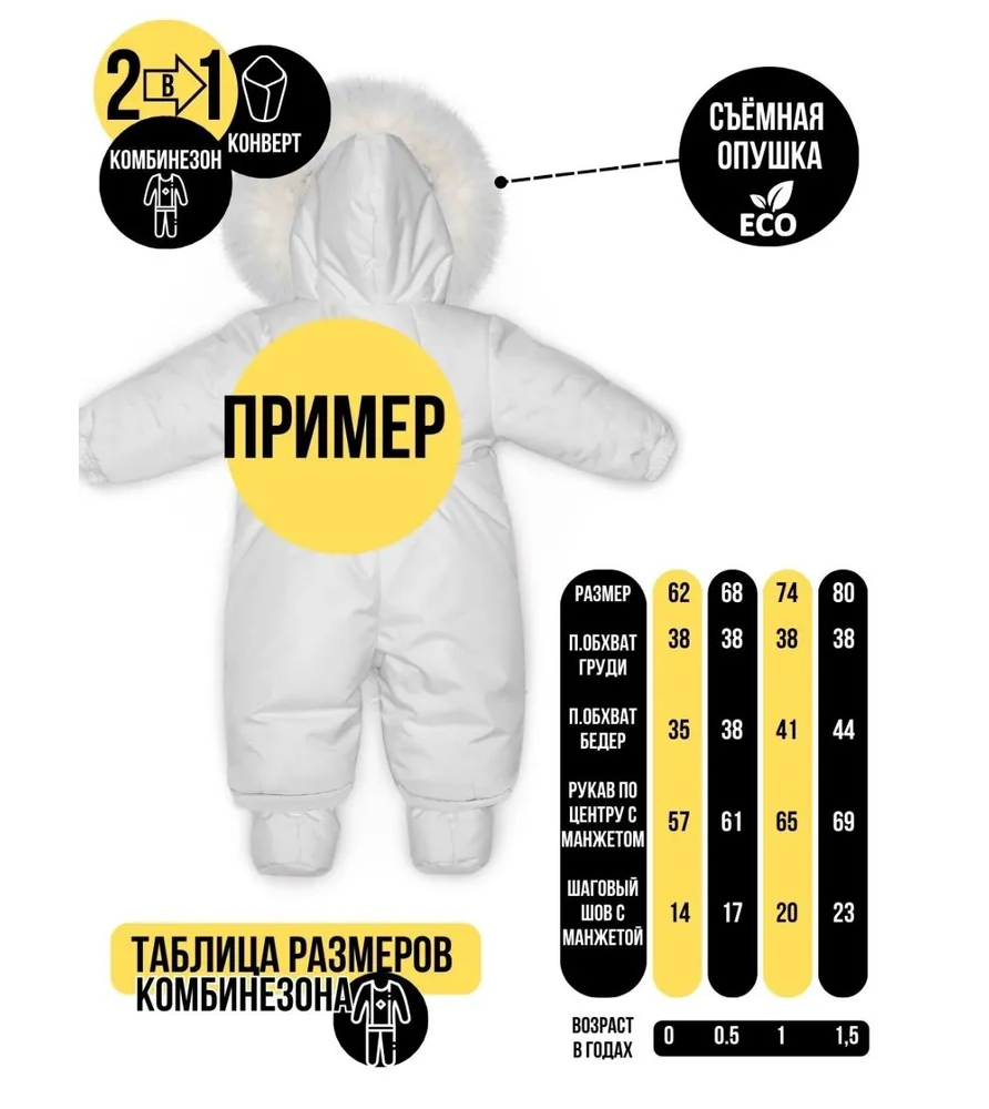 Детский комбинезон-трансформер MaLeK BaBy — идеальное решение для новорождённых и малышей от 0 до 18 месяцев Откройте для себя идеальное сочетание функциональности, тепла и стиля в зимнем комбинезоне-трансформере MaLeK BaBy — созданном специально для новорождённых, чтобы защищать вашего малыша от непогоды с первых дней жизни. Этот комбинезон подходит для использования в течение трёх сезонов, благодаря продуманной системе трансформации и премиальным материалам. Особенности и преимущества: Температурный режим: от +5 до -25°C — идеален как зимний комбинезон, так и демисезонный комбинезон для новорожденных; Мембранная ткань – прочная, ветрозащитная, влагостойкая и при этом «дышащая»; Съёмная шерстяная подкладка – тёплая, дышащая, подходит для морозной зимы и легко снимается в межсезонье; Съёмные пинетки – защищают ножки от холода, легко отстёгиваются в помещении или в тёплую погоду; Отвороты на рукавах — позволяют обойтись без варежек, надёжно закрывая ручки; Капюшон с ушками и съёмной опушкой — милый дизайн и дополнительная защита от ветра; Светоотражающие элементы — повышают безопасность малыша в условиях плохой видимости; Каждое изделие проходит проверку качества — надёжность, безопасность и внимание к каждой детали. Механизм трансформации Комбинезон MaLeK BaBy — это универсальное 2-в-1 решение, которое с лёгкостью превращается из утеплённого зимнего комбинезона в демисезонный вариант: В зимнем варианте используется съёмная подкладка с натуральным шерстяным волокном — идеальный выбор для температуры до -25°С. Весной и осенью подкладка легко извлекается, и комбинезон становится лёгким и комфортным даже при +5°C. Съёмные пинетки и возможность трансформации ножек с помощью молний позволяют быстро адаптировать изделие под обувь или использовать как конверт-комбинезон трансформер — удобно как для прогулок, так и для сна малыша. Молнии на ножках позволяют быстро расстегнуть низ и трансформировать комбинезон в классический конверт или облегчённую модель без ножек. Это особенно удобно в коляске, на переодевании или при смене погоды. Назначение и аудитория Комбинезон-трансформер MaLeK BaBy идеально подойдёт: для новорожденных и детей до 18 месяцев; как первый зимний комбинезон для малыша; для родителей, ищущих детские комбинезоны трансформеры, совмещающие стиль и практичность; для тех, кто хочет купить комбинезон трансформер зимний с возможностью ношения в межсезонье. Почему выбирают MaLeK BaBy: Безопасность и проверенное качество; Высокотехнологичные материалы и пошив; Изысканный внешний вид с капюшоном-«ушки»; Производство с учётом потребностей российских родителей и климата.