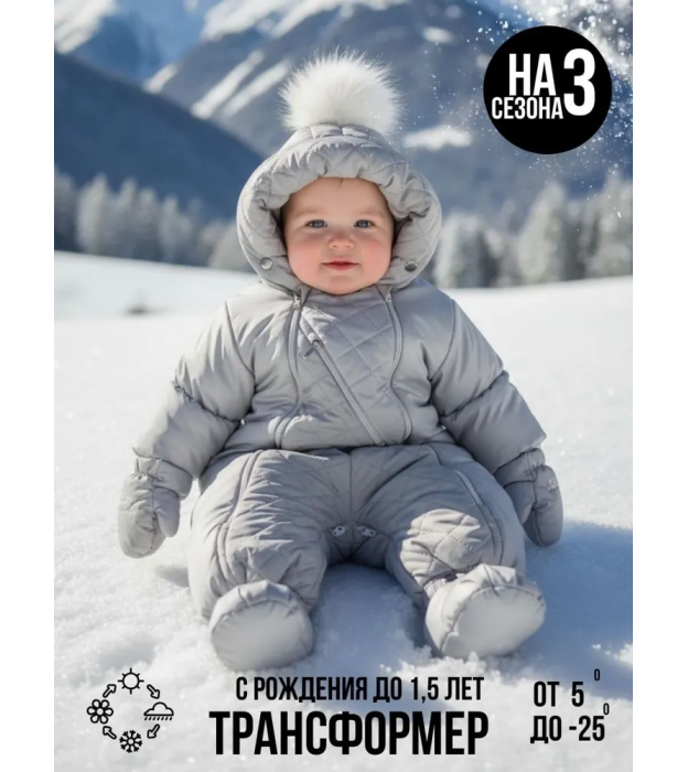 Детский комбинезон-трансформер MaLeK BaBy — идеальное решение для новорождённых и малышей от 0 до 18 месяцев Откройте для себя идеальное сочетание функциональности, тепла и стиля в зимнем комбинезоне-трансформере MaLeK BaBy — созданном специально для новорождённых, чтобы защищать вашего малыша от непогоды с первых дней жизни. Этот комбинезон подходит для использования в течение трёх сезонов, благодаря продуманной системе трансформации и премиальным материалам. Особенности и преимущества: Температурный режим: от +5 до -25°C — идеален как зимний комбинезон, так и демисезонный комбинезон для новорожденных; Мембранная ткань – прочная, ветрозащитная, влагостойкая и при этом «дышащая»; Съёмная шерстяная подкладка – тёплая, дышащая, подходит для морозной зимы и легко снимается в межсезонье; Съёмные пинетки – защищают ножки от холода, легко отстёгиваются в помещении или в тёплую погоду; Отвороты на рукавах — позволяют обойтись без варежек, надёжно закрывая ручки; Капюшон с ушками и съёмной опушкой — милый дизайн и дополнительная защита от ветра; Светоотражающие элементы — повышают безопасность малыша в условиях плохой видимости; Каждое изделие проходит проверку качества — надёжность, безопасность и внимание к каждой детали. Механизм трансформации Комбинезон MaLeK BaBy — это универсальное 2-в-1 решение, которое с лёгкостью превращается из утеплённого зимнего комбинезона в демисезонный вариант: В зимнем варианте используется съёмная подкладка с натуральным шерстяным волокном — идеальный выбор для температуры до -25°С. Весной и осенью подкладка легко извлекается, и комбинезон становится лёгким и комфортным даже при +5°C. Съёмные пинетки и возможность трансформации ножек с помощью молний позволяют быстро адаптировать изделие под обувь или использовать как конверт-комбинезон трансформер — удобно как для прогулок, так и для сна малыша. Молнии на ножках позволяют быстро расстегнуть низ и трансформировать комбинезон в классический конверт или облегчённую модель без ножек. Это особенно удобно в коляске, на переодевании или при смене погоды. Назначение и аудитория Комбинезон-трансформер MaLeK BaBy идеально подойдёт: для новорожденных и детей до 18 месяцев; как первый зимний комбинезон для малыша; для родителей, ищущих детские комбинезоны трансформеры, совмещающие стиль и практичность; для тех, кто хочет купить комбинезон трансформер зимний с возможностью ношения в межсезонье. Почему выбирают MaLeK BaBy: Безопасность и проверенное качество; Высокотехнологичные материалы и пошив; Изысканный внешний вид с капюшоном-«ушки»; Производство с учётом потребностей российских родителей и климата.