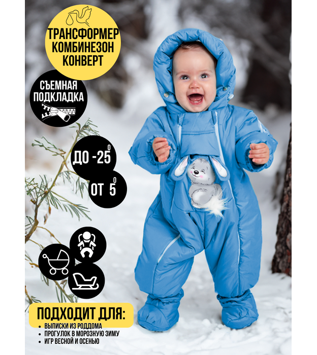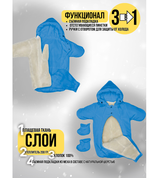 Комбинезон-трансформер детский зимний. Изготовлен из водонепроницаемого, не продуваемого, сверхпрочного материала и утеплен съемной подкладкой, в составе которой натуральная овечья шерсть. Он прослужит вашему малышу не один сезон, в зависимости от возраста вашего малыша и погодных условий вы можете использовать изделие как конверт или комбинезон. В режиме конверт модель идеальна для новорожденных, позволяет не тревожить малыша при одевании и раздевании во время сна, при желании с помощью молнии конверт легко трансформируется в комбинезон. Когда потеплеет, вы можете снять шерстяную подкладку, и комбинезон подойдет для весенней погоды. Отвороты на рукавах заменяют варежки, которые согреют маленькие ручки вашего малыша в холодную погоду. Плотно прилегающий к голове капюшон защитит от сильного ветра за счет вшитой утягивающей резинки. В комплекте идут отстегивающиеся пинетки, которые, будут греть ножки, и не будут выделяться из общего стиля.